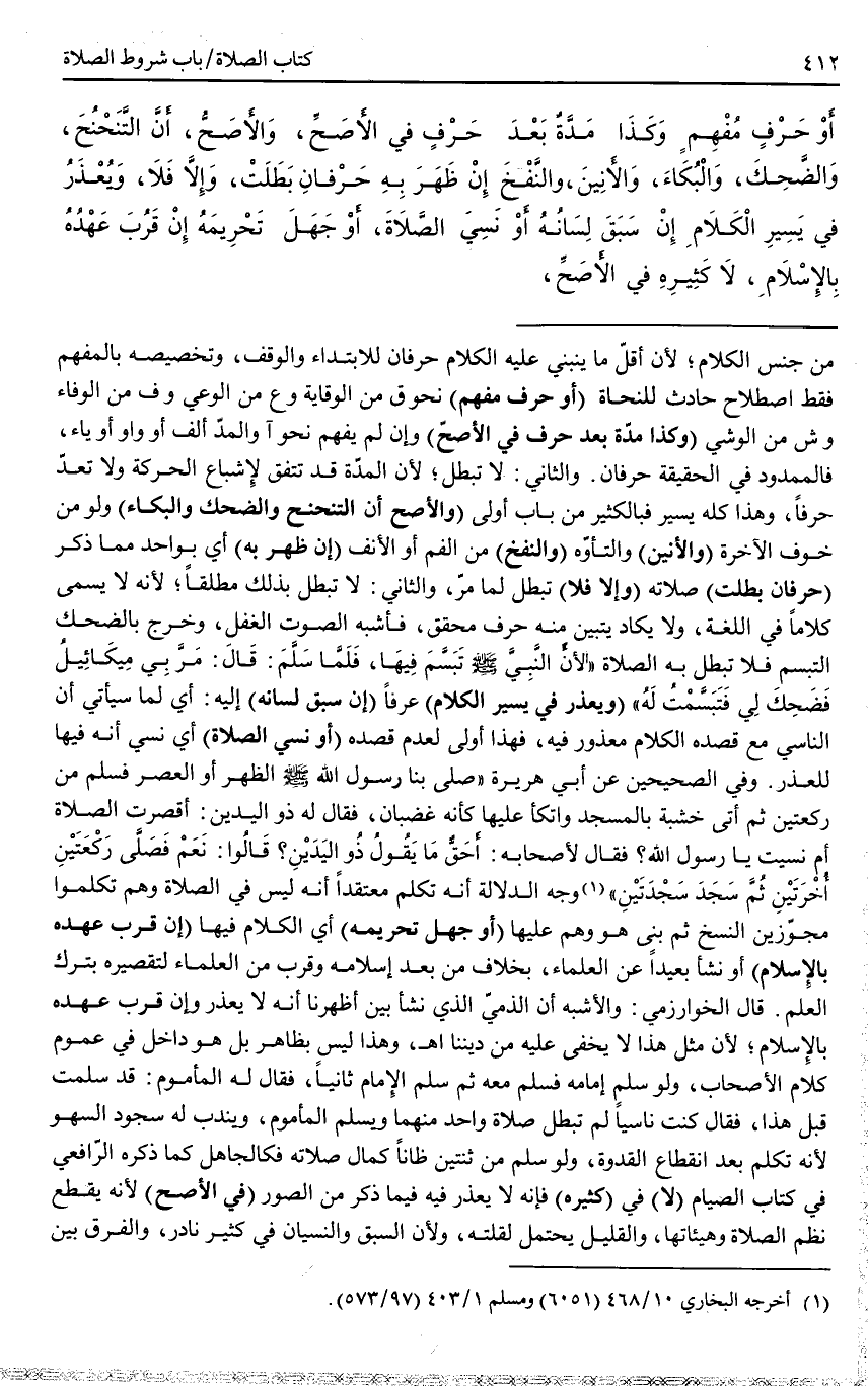 وَالثَّالِثُ: لَا تَبْطُلُ بِذَلِكَ مُطْلَقًا؛ لِأَنَّهُ لَا يُسَمَّى كَلَامًا فِي اللُّغَةِ، وَلَا يَكَادُ يَتَبَيَّنُ مِنْهُ حَرْفٌ مُحَقَّقٌ، فَأَشْبَهَ الصَّوْتَ الْغُفْلَ، وَخَرَجَ بِالضَّحِكِ التَّبَسُّمُ فَلَا تَبْطُلُ بِهِ الصَّلَاةُ «لِأَنَّ النَّبِيَّ - صَلَّى اللَّهُ عَلَيْهِ وَسَلَّمَ - تَبَسَّمَ فِيهَا، فَلَمَّا سَلَّمَ: قَالَ: مَرَّ بِي مِيكَائِيلُ فَضَحِكَ لِي فَتَبَسَّمْتُ لَهُ» (وَيُعْذَرُ فِي يَسِيرِ الْكَلَامِ) عُرْفًا (إنْ سَبَقَ لِسَانُهُ) إلَيْهِ: أَيْ: لِمَا سَيَأْتِي أَنَّ النَّاسِيَ مَعَ قَصْدِهِ الْكَلَامَ مَعْذُورٌ فِيهِ، فَهَذَا أَوْلَى لِعَدَمِ قَصْدِهِ (أَوْ نَسِيَ الصَّلَاةَ) أَيْ: نَسِيَ أَنَّهُ فِيهَا لِلْعُذْرِ. وَفِي الصَّحِيحَيْنِ عَنْ أَبِي هُرَيْرَةَ «صَلَّى بِنَا رَسُولُ اللَّهِ - صَلَّى اللَّهُ عَلَيْهِ وَسَلَّمَ - الظُّهْرَ أَوْ الْعَصْرَ فَسَلَّمَ مِنْ رَكْعَتَيْنِ ثُمَّ أَتَى خَشَبَةً بِالْمَسْجِدِ وَاتَّكَأَ عَلَيْهَا كَأَنَّهُ غَضْبَانُ، فَقَالَ لَهُ ذُو الْيَدَيْنِ: أَقَصُرَتْ الصَّلَاةُ أَمْ نَسِيتَ يَا رَسُولَ اللَّهِ؟ فَقَالَ لِأَصْحَابِهِ: أَحَقٌّ مَا يَقُولُ ذُو الْيَدَيْنِ؟ قَالُوا: نَعَمْ فَصَلَّى رَكْعَتَيْنِ أُخْرَتَيْنِ ثُمَّ سَجَدَ سَجْدَتَيْنِ» (1) وَجْهُ الدَّلَالَةِ أَنَّهُ تَكَلَّمَ مُعْتَقِدًا أَنَّهُ لَيْسَ فِي الصَّلَاةِ وَهُمْ تَكَلَّمُوا مُجَوِّزِينَ النَّسْخَ ثُمَّ بَنَى هُوَ، وَهُمْ عَلَيْهَا (أَوْ جَهِلَ تَحْرِيمَهُ) أَيْ: الْكَلَامِ فِيهَا (إنْ قَرُبَ عَهْدُهُ بِالْإِسْلَامِ) أَوْ نَشَأَ بَعِيدًا عَنْ الْعُلَمَاءِ، بِخِلَافِ مَنْ بَعُدَ إسْلَامُهُ، وَقَرُبَ مِنْ الْعُلَمَاءِ لِتَقْصِيرِهِ بِتَرْكِ الْعِلْمِ. قَالَ الْخُوَارِزْمِيُّ: وَالْأَشْبَهُ أَنَّ الذِّمِّيَّ الَّذِي نَشَأَ بَيْنَ أَظْهُرِنَا أَنَّهُ لَا يُعْذَرُ وَإِنْ قَرُبَ عَهْدُهُ بِالْإِسْلَامِ؛ لِأَنَّ مِثْلَ هَذَا لَا يَخْفَى عَلَيْهِ مِنْ دِينِنَا. اهـ.