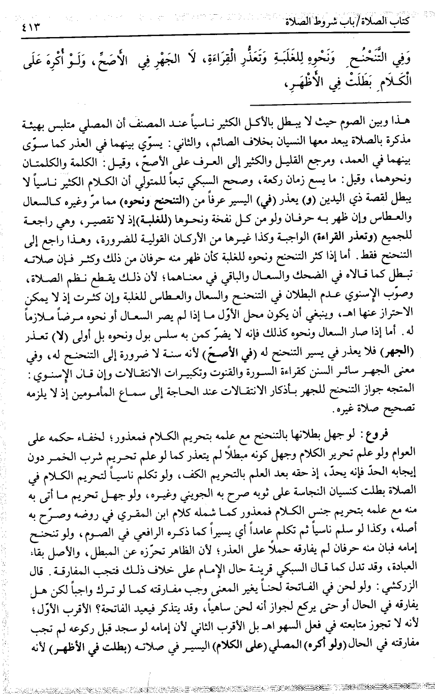 وَالثَّانِي: يُسَوِّي بَيْنَهُمَا فِي الْعُذْرِ كَمَا سَوَّى بَيْنَهُمَا فِي الْعَمْدِ، وَمَرْجِعُ الْقَلِيلِ وَالْكَثِيرِ إلَى الْعُرْفِ عَلَى الْأَصَحِّ، وَقِيلَ: الْكَلِمَةُ وَالْكَلِمَتَانِ وَنَحْوُهُمَا، وَقِيلَ: مَا يَسَعُ زَمَانَ رَكْعَةٍ، وَصَحَّحَ السُّبْكِيُّ تَبَعًا لِلْمُتَوَلِّي أَنَّ الْكَلَامَ الْكَثِيرَ نَاسِيًا لَا يُبْطِلُ لِقِصَّةِ ذِي الْيَدَيْنِ (وَ) يُعْذَرُ (فِي) الْيَسِيرِ عُرْفًا مِنْ (التَّنَحْنُحِ وَنَحْوِهِ) مِمَّا مَرَّ وَغَيْرِهِ كَالسُّعَالِ وَالْعُطَاسِ، وَإِنْ ظَهَرَ بِهِ حَرْفَانِ، وَلَوْ مِنْ كُلِّ نَفْخَةٍ وَنَحْوِهَا (لِلْغَلَبَةِ) إذْ لَا تَقْصِيرَ، وَهِيَ رَاجِعَةٌ لِلْجَمِيعِ (وَتَعَذُّرِ الْقِرَاءَةِ) الْوَاجِبَةِ، وَكَذَا غَيْرُهَا مِنْ الْأَرْكَانِ الْقَوْلِيَّةِ لِلضَّرُورَةِ، وَهَذَا رَاجِعٌ إلَى التَّنَحْنُحِ فَقَطْ. أَمَّا إذَا كَثُرَ التَّنَحْنُحُ وَنَحْوُهُ لِلْغَلَبَةِ كَأَنْ ظَهَرَ مِنْهُ حَرْفَانِ مِنْ ذَلِكَ وَكَثُرَ، فَإِنَّ صَلَاتَهُ تَبْطُلُ كَمَا قَالَاهُ فِي الضَّحِكِ وَالسُّعَالِ وَالْبَاقِي فِي مَعْنَاهُمَا؛ لِأَنَّ ذَلِكَ يَقْطَعُ نَظْمَ الصَّلَاةِ، وَصَوَّبَ الْإِسْنَوِيُّ عَدَمَ الْبُطْلَانِ فِي التَّنَحْنُحِ وَالسُّعَالِ وَالْعُطَاسِ لِلْغَلَبَةِ، وَإِنْ كَثُرَتْ إذْ لَا يُمْكِنُ الِاحْتِرَازُ عَنْهَا. اهـ.