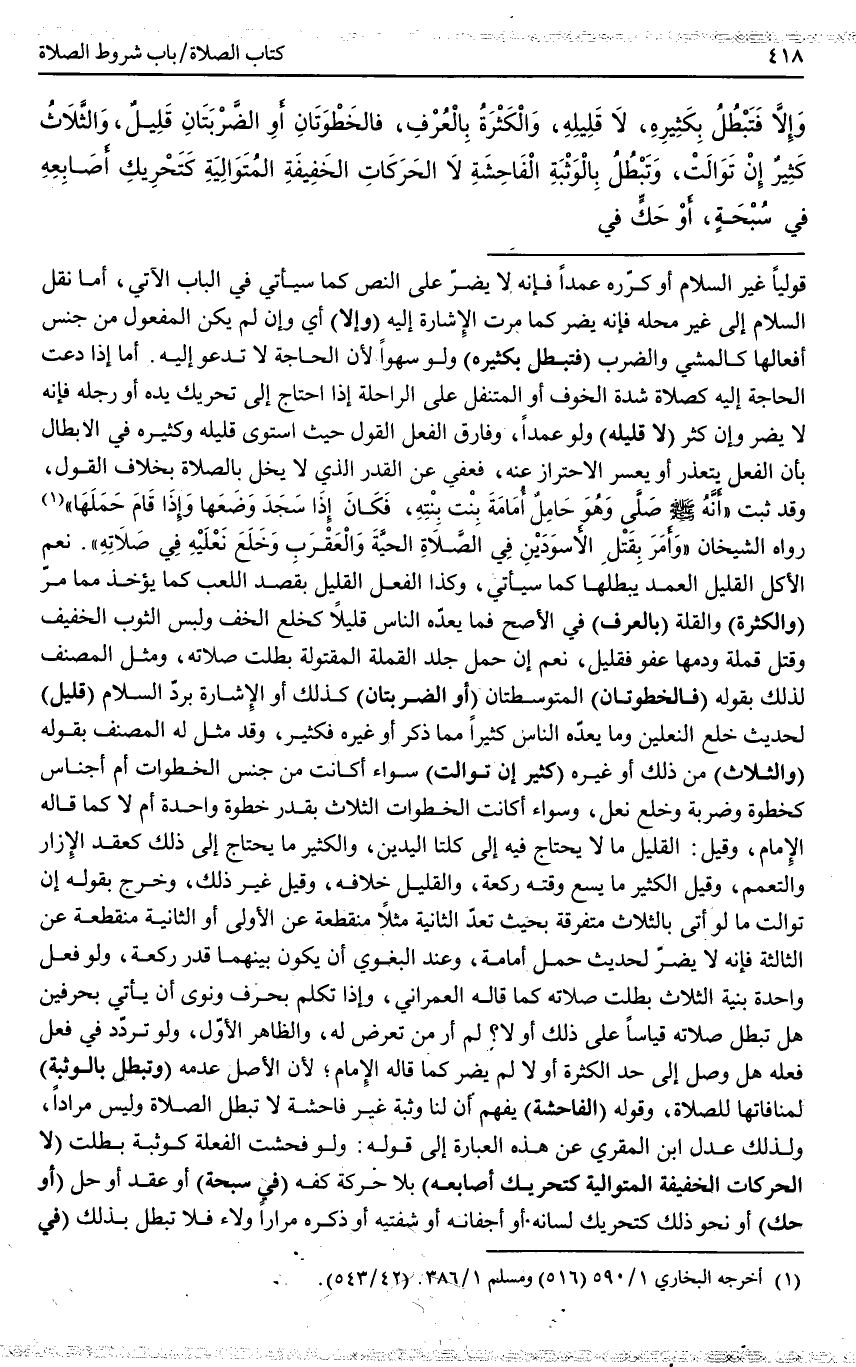 وَإِلَّا فَتَبْطُلُ بِكَثِيرِهِ، لَا قَلِيلِهِ، وَالْكَثْرَةُ بِالْعُرْفِ، فَالْخُطْوَتَانِ أَوْ الضَّرْبَتَانِ قَلِيلٌ، وَالثَّلَاثُ كَثِيرٌ إنْ تَوَالَتْ، وَتَبْطُلُ بِالْوَثْبَةِ الْفَاحِشَةِ لَا الْحَرَكَاتِ الْخَفِيفَةِ الْمُتَوَالِيَةِ كَتَحْرِيكِ أَصَابِعِهِ فِي سَبْحَةٍ، أَوْ حَكٍّ فِي