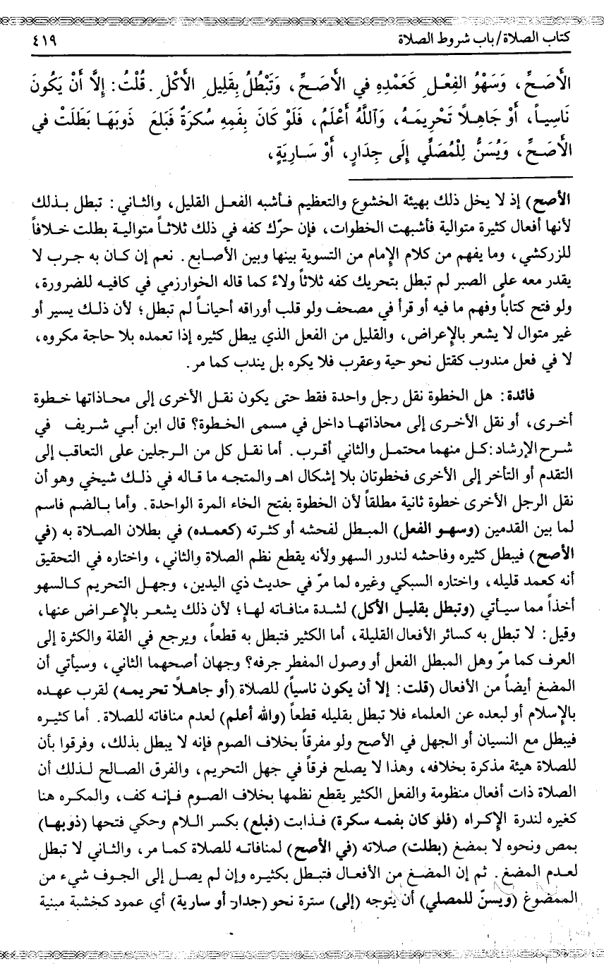 وَالثَّانِي: تَبْطُلُ بِذَلِكَ لِأَنَّهَا أَفْعَالٌ كَثِيرَةٌ مُتَوَالِيَةٌ فَأَشْبَهَتْ الْخُطُوَاتِ، فَإِنْ حَرَّكَ كَفَّهُ فِي ذَلِكَ ثَلَاثًا مُتَوَالِيَةً بَطَلَتْ خِلَافًا لِلزَّرْكَشِيِّ، وَمَا يُفْهَمُ مِنْ كَلَامِ الْإِمَامِ مِنْ التَّسْوِيَةِ بَيْنَهَا وَبَيْنَ الْأَصَابِعِ. نَعَمْ إنْ كَانَ بِهِ جَرَبٌ لَا يَقْدِرُ مَعَهُ عَلَى الصَّبْرِ لَمْ تَبْطُلْ بِتَحْرِيكِ كَفِّهِ ثَلَاثًا وِلَاءً كَمَا قَالَهُ الْخُوَارِزْمِيُّ فِي كَافِيهِ لِلضَّرُورَةِ، وَلَوْ فَتَحَ كِتَابًا، وَفَهِمَ مَا فِيهِ أَوْ قَرَأَ فِي مُصْحَفٍ، وَلَوْ قَلَّبَ أَوْرَاقَهُ أَحْيَانًا لَمْ تَبْطُلْ؛ لِأَنَّ ذَلِكَ يَسِيرٌ أَوْ غَيْرُ مُتَوَالٍ لَا يُشْعِرُ بِالْإِعْرَاضِ، وَالْقَلِيلُ مِنْ الْفِعْلِ الَّذِي يُبْطِلُ كَثِيرُهُ إذَا تَعَمَّدَهُ بِلَا حَاجَةٍ مَكْرُوهٌ، لَا فِي فِعْلٍ مَنْدُوبٍ كَقَتْلِ نَحْوِ حَيَّةٍ وَعَقْرَبٍ، فَلَا يُكْرَهُ بَلْ يُنْدَبُ كَمَا مَرَّ.