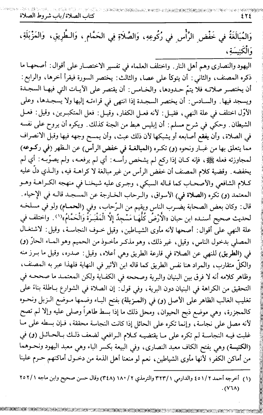 وَالْمُبَالَغَةُ فِي خَفْضِ الرَّأْسِ فِي رُكُوعِهِ، وَالصَّلَاةُ فِي الْحَمَّامِ، وَالطَّرِيقِ، وَالْمَزْبَلَةِ، وَالْكَنِيسَةِ،