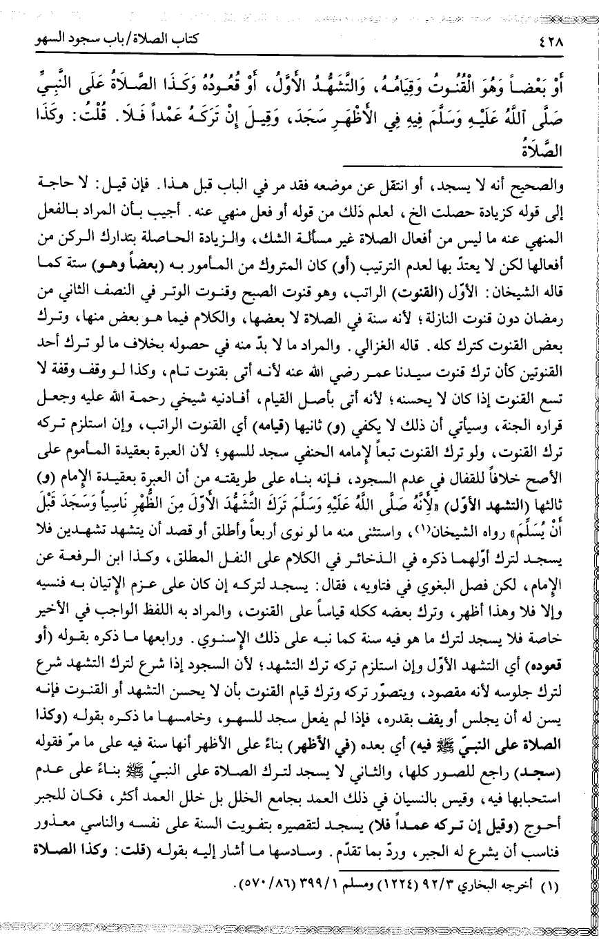 أُجِيبَ بِأَنَّ الْمُرَادَ بِالْفِعْلِ الْمَنْهِيِّ عَنْهُ مَا لَيْسَ مِنْ أَفْعَالِ الصَّلَاةِ غَيْرَ مَسْأَلَةِ الشَّكِّ، وَالزِّيَادَةُ الْحَاصِلَةُ بِتَدَارُكِ الرُّكْنِ مِنْ أَفْعَالِهَا لَكِنْ لَا يُعْتَدُّ بِهَا لِعَدَمِ التَّرْتِيبِ (أَوْ) كَانَ الْمَتْرُوكُ مِنْ الْمَأْمُورِ بِهِ (بَعْضًا وَهُوَ) سُنَّةٌ كَمَا قَالَهُ الشَّيْخَانِ: الْأَوَّلُ (الْقُنُوتُ) الرَّاتِبُ، وَهُوَ قُنُوتُ الصُّبْحِ وَقُنُوتُ الْوِتْرِ فِي النِّصْفِ الثَّانِي مِنْ رَمَضَانَ دُونَ قُنُوتِ النَّازِلَةِ؛ لِأَنَّهُ سُنَّةٌ فِي الصَّلَاةِ لَا بَعْضِهَا، وَالْكَلَامُ فِيمَا هُوَ بَعْضٌ مِنْهَا، وَتَرْكُ بَعْضِ الْقُنُوتِ كَتَرْكِ كُلِّهِ. قَالَهُ الْغَزَالِيُّ. وَالْمُرَادُ مَا لَا بُدَّ مِنْهُ فِي حُصُولِهِ بِخِلَافِ مَا لَوْ تَرَكَ أَحَدَ الْقُنُوتَيْنِ كَأَنْ تَرَكَ قُنُوتَ سَيِّدِنَا عُمَرَ - رَضِيَ اللَّهُ عَنْهُ - لِأَنَّهُ أَتَى بِقُنُوتٍ تَامٍّ، وَكَذَا لَوْ وَقَفَ وَقْفَةً لَا تَسَعُ الْقُنُوتَ إذَا كَانَ لَا يُحْسِنُهُ؛ لِأَنَّهُ أَتَى بِأَصْلِ الْقِيَامِ، أَفَادَنِيهِ شَيْخِي رَحْمَةُ اللَّهِ عَلَيْهِ وَجَعَلَ قَرَارَهُ الْجَنَّةَ، وَسَيَأْتِي أَنَّ ذَلِكَ لَا يَكْفِي (