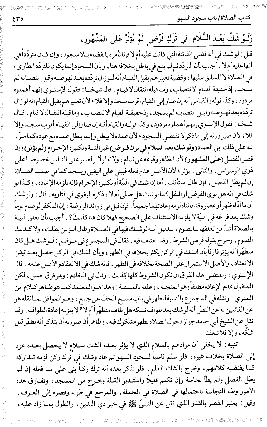 تَنْبِيهٌ: لَا يَخْفَى أَنَّ مُرَادَهُمْ بِالسَّلَامِ الَّذِي لَا يُؤَثِّرُ بَعْدَهُ الشَّكُّ سَلَامٌ لَا يَحْصُلُ بَعْدَهُ عَوْدٌ إلَى الصَّلَاةِ بِخِلَافِ غَيْرِهِ، فَلَوْ سَلَّمَ نَاسِيًا لِسُجُودِ السَّهْوِ ثُمَّ عَادَ وَشَكَّ فِي تَرْكِ رُكْنٍ لَزِمَهُ تَدَارُكُهُ كَمَا يَقْتَضِيهِ كَلَامُهُمْ، وَخَرَجَ بِالشَّكِّ الْعِلْمُ، فَلَوْ تَذَكَّرَ بَعْدَهُ أَنَّهُ تَرَكَ رُكْنًا بَنَى عَلَى مَا فَعَلَهُ إنْ لَمْ يُطِلْ الْفَصْلَ وَلَمْ يَطَأْ نَجَاسَةً وَإِنْ تَكَلَّمَ قَلِيلًا وَاسْتَدْبَرَ الْقِبْلَةَ وَخَرَجَ مِنْ الْمَسْجِدِ، وَتُفَارِقُ هَذِهِ الْأُمُورُ وَطْءَ النَّجَاسَةِ بِاحْتِمَالِهَا فِي الصَّلَاةِ فِي الْجُمْلَةِ، وَالْمَرْجِعُ فِي طُولِهِ وَقِصَرِهِ إلَى الْعُرْفِ. وَقِيلَ: يُعْتَبَرُ الْقِصَرُ بِالْقَدْرِ الَّذِي نُقِلَ عَنْ النَّبِيِّ - صَلَّى اللَّهُ عَلَيْهِ وَسَلَّمَ - فِي خَبَرِ ذِي الْيَدَيْنِ، وَالطُّولُ بِمَا زَادَ عَلَيْهِ،