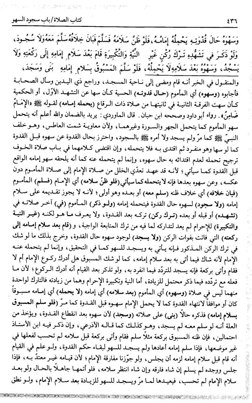 ـــــــــــــــــــــــــــــQوَالْمَنْقُولُ فِي الْخَبَرِ «أَنَّهُ قَامَ وَمَضَى إلَى نَاحِيَةِ الْمَسْجِدِ، وَرَاجَعَ ذِي الْيَدَيْنِ وَسَأَلَ الصَّحَابَةَ فَأَجَابُوهُ» (وَسَهْوُهُ) أَيْ الْمَأْمُومِ (حَالَ قُدْوَتِهِ) الْحِسِّيَّةِ كَأَنْ سَهَا عَنْ التَّشَهُّدِ الْأَوَّلِ، أَوْ الْحُكْمِيَّةِ كَأَنْ سَهَتْ الْفِرْقَةُ الثَّانِيَةُ فِي ثَانِيَتِهَا مِنْ صَلَاةِ ذَاتِ الرِّقَاعِ (يَحْمِلُهُ إمَامُهُ) «لِقَوْلِهِ - صَلَّى اللَّهُ عَلَيْهِ وَسَلَّمَ - الْإِمَامُ ضَامِنٌ» . رَوَاهُ أَبُو دَاوُد وَصَحَّحَهُ ابْنُ حِبَّانَ. قَالَ الْمَاوَرْدِيُّ: يُرِيدُ بِالضَّمَانِ وَاَللَّهُ أَعْلَمُ أَنَّهُ يَتَحَمَّلُ سَهْوَ الْمَأْمُومِ كَمَا يَتَحَمَّلُ الْجَهْرَ وَالسُّورَةَ وَغَيْرَهُمَا، وَلِأَنَّ مُعَاوِيَةَ شَمَّتَ الْعَاطِسَ، وَهُوَ خَلْفَ النَّبِيِّ - صَلَّى اللَّهُ عَلَيْهِ وَسَلَّمَ - كَمَا مَرَّ وَلَمْ يَسْجُدْ وَلَا أَمَرَهُ - صَلَّى اللَّهُ عَلَيْهِ وَسَلَّمَ - بِالسُّجُودِ، وَاحْتُرِزَ بِحَالِ الْقُدْوَةِ عَنْ سَهْوِهِ قَبْلَ الْقُدْوَةِ كَمَا لَوْ سَهَا وَهُوَ مُنْفَرِدٌ ثُمَّ اقْتَدَى بِهِ فَلَا يَتَحَمَّلُهُ، وَإِنْ اقْتَضَى كَلَامُهُمَا فِي بَابِ صَلَاةِ الْخَوْفِ تَرْجِيحَ تَحَمُّلِهِ لِعَدَمِ اقْتِدَائِهِ بِهِ حَالَ سَهْوِهِ، وَإِنَّمَا لَمْ يَتَحَمَّلْهُ عَنْهُ كَمَا أَنَّهُ يَلْحَقُهُ سَهْوُ إمَامِهِ الْوَاقِعُ قَبْلَ الْقُدْوَةِ كَمَا سَيَأْتِي؛ لِأَنَّهُ قَدْ عَهِدَ تَعَدِّي الْخَلَلِ مِنْ صَلَاةِ الْإِمَامِ إلَى صَلَاةِ الْمَأْمُومِ دُونَ عَكْسِهِ، وَعَنْ سَهْوِهِ بَعْدَهَا فَإِنَّهُ لَا يَتَحَمَّلُهُ كَمَا سَيَأْتِي.