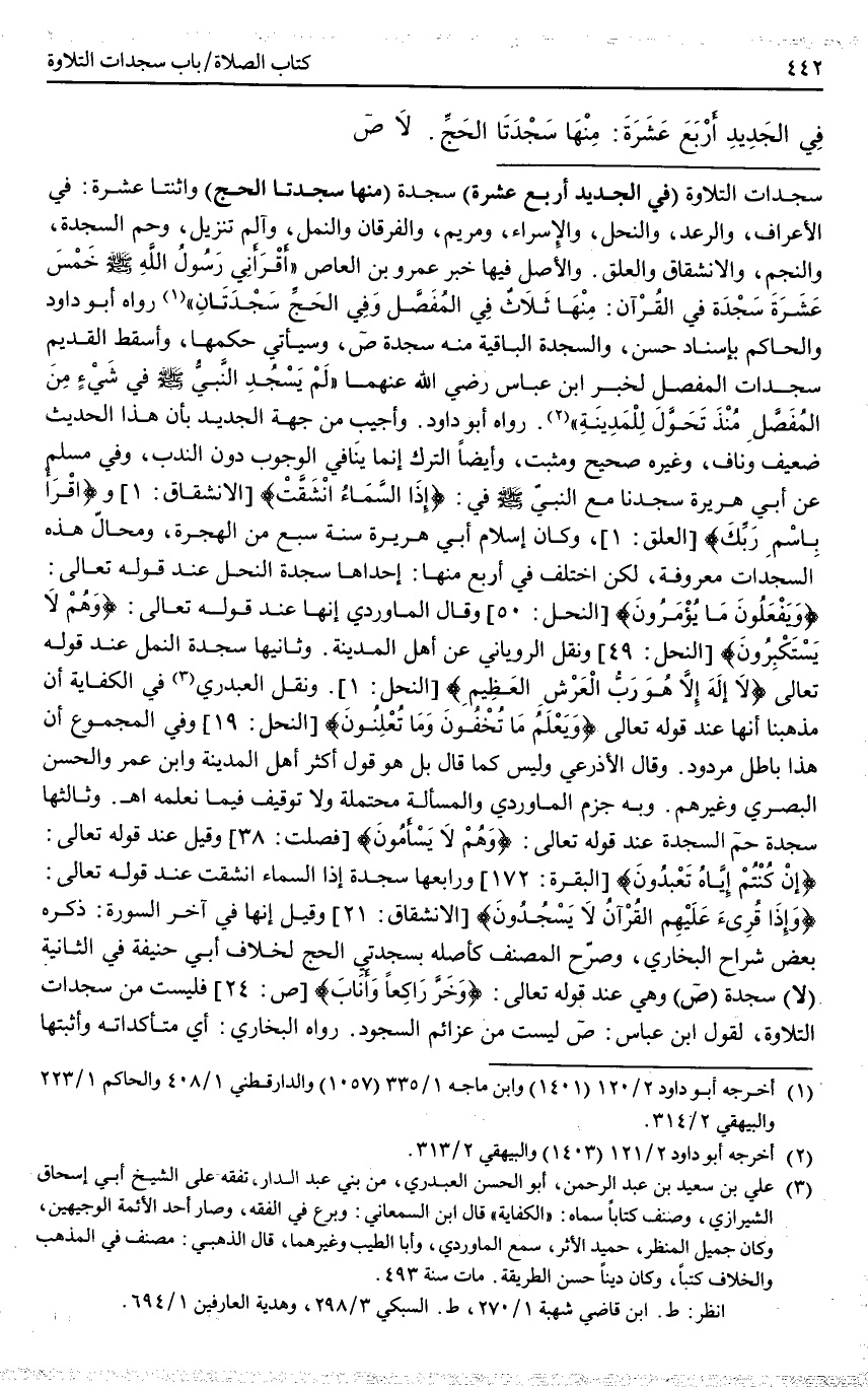 ـــــــــــــــــــــــــــــQسَجَدَاتُ التِّلَاوَةِ (فِي الْجَدِيدِ أَرْبَعَ عَشْرَةَ) سَجْدَةً (مِنْهَا سَجْدَتَا الْحَجِّ) وَاثْنَتَا عَشْرَةَ: فِي الْأَعْرَافِ، وَالرَّعْدِ، وَالنَّحْلِ، وَالْإِسْرَاءِ، وَمَرْيَمَ، وَالْفُرْقَانِ وَالنَّمْلِ، وَالَمْ تَنْزِيلُ، وَحُمَّ السَّجْدَةِ وَالنَّجْمِ، وَالِانْشِقَاقِ وَالْعَلَقِ. وَالْأَصْلُ فِيهَا خَبَرُ عَمْرِو بْنِ الْعَاصِ «أَقْرَأَنِي رَسُولُ اللَّهِ - صَلَّى اللَّهُ عَلَيْهِ وَسَلَّمَ - خَمْسَ عَشْرَةَ سَجْدَةً فِي الْقُرْآنِ: مِنْهَا ثَلَاثٌ فِي الْمُفَصَّلِ وَفِي الْحَجِّ سَجْدَتَانِ» رَوَاهُ أَبُو دَاوُد وَالْحَاكِمُ بِإِسْنَادٍ حَسَنٍ، وَالسَّجْدَةُ الْبَاقِيَةُ مِنْهُ سَجْدَةُ (ص) ، وَسَيَأْتِي حُكْمُهَا، وَأَسْقَطَ الْقَدِيمُ سَجَدَاتِ الْمُفَصَّلِ لِخَبَرِ ابْنِ عَبَّاسٍ - رَضِيَ اللَّهُ عَنْهُمَا - «لَمْ يَسْجُدْ النَّبِيُّ - صَلَّى اللَّهُ عَلَيْهِ وَسَلَّمَ - فِي شَيْءٍ مِنْ الْمُفَصَّلِ مُنْذُ تَحَوَّلَ لِلْمَدِينَةِ» رَوَاهُ أَبُو دَاوُد. .