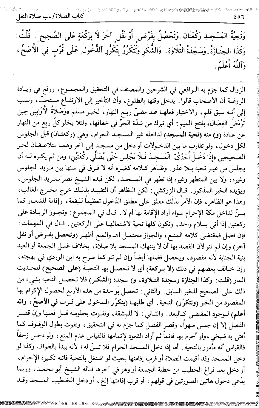 وَتَحِيَّةُ الْمَسْجِدِ رَكْعَتَانِ. وَتَحْصُلُ بِفَرْضٍ أَوْ نَفْلٍ آخَرَ لَا بِرَكْعَةٍ عَلَى الصَّحِيحِ. قُلْت: وَكَذَا الْجِنَازَةُ. وَسَجْدَةُ التِّلَاوَةِ وَالشُّكْرِ وَتَتَكَرَّرُ بِتَكَرُّرِ الدُّخُولِ عَلَى قُرْبٍ فِي الْأَصَحِّ، وَاَللَّهُ أَعْلَمُ.