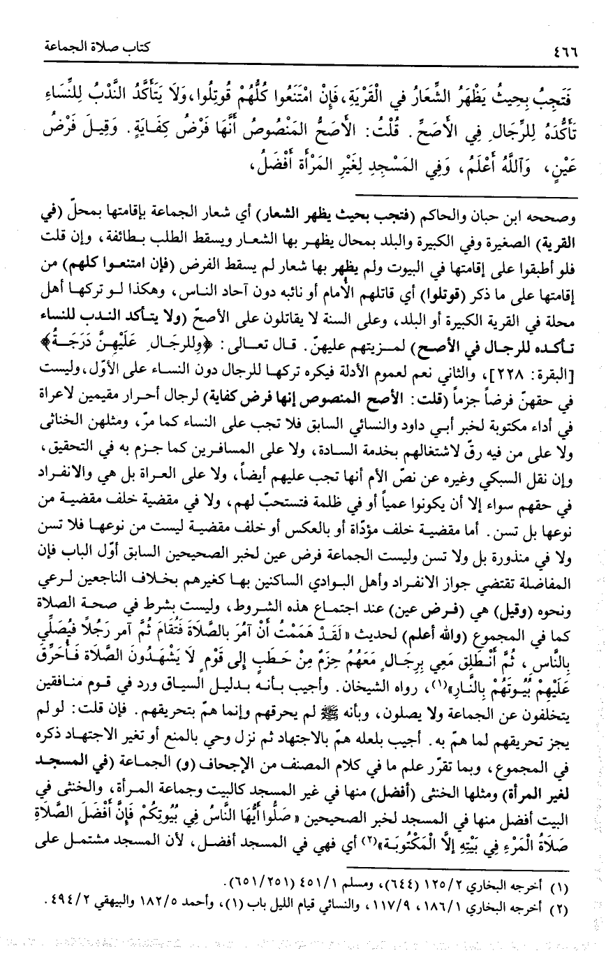 ـــــــــــــــــــــــــــــQوَصَحَّحَهُ ابْنُ حِبَّانَ وَالْحَاكِمُ (فَتَجِبُ بِحَيْثُ يَظْهَرُ الشِّعَارُ) أَيْ شِعَارُ الْجَمَاعَةِ بِإِقَامَتِهَا بِمَحَلٍّ (فِي الْقَرْيَةِ) الصَّغِيرَةِ وَفِي الْكَبِيرَةِ وَالْبَلَدِ بِمَحَالَّ يَظْهَرُ بِهَا الشِّعَارُ وَيَسْقُطُ الطَّلَبُ بِطَائِفَةٍ، وَإِنْ قُلْت فَلَوْ أَطْبَقُوا عَلَى إقَامَتِهَا فِي الْبُيُوتِ وَلَمْ يَظْهَرْ بِهَا شِعَارٌ لَمْ يَسْقُطْ الْفَرْضُ (فَإِنْ امْتَنَعُوا كُلُّهُمْ) مِنْ إقَامَتِهَا عَلَى مَا ذُكِرَ (قُوتِلُوا) أَيْ قَاتَلَهُمْ الْإِمَامُ أَوْ نَائِبُهُ دُونَ آحَادِ النَّاسِ، وَهَكَذَا لَوْ تَرَكَهَا أَهْلُ مَحَلَّةٍ فِي الْقَرْيَةِ الْكَبِيرَةِ أَوْ الْبَلَدِ، وَعَلَى السُّنَّةِ لَا يُقَاتَلُونَ عَلَى الْأَصَحِّ.