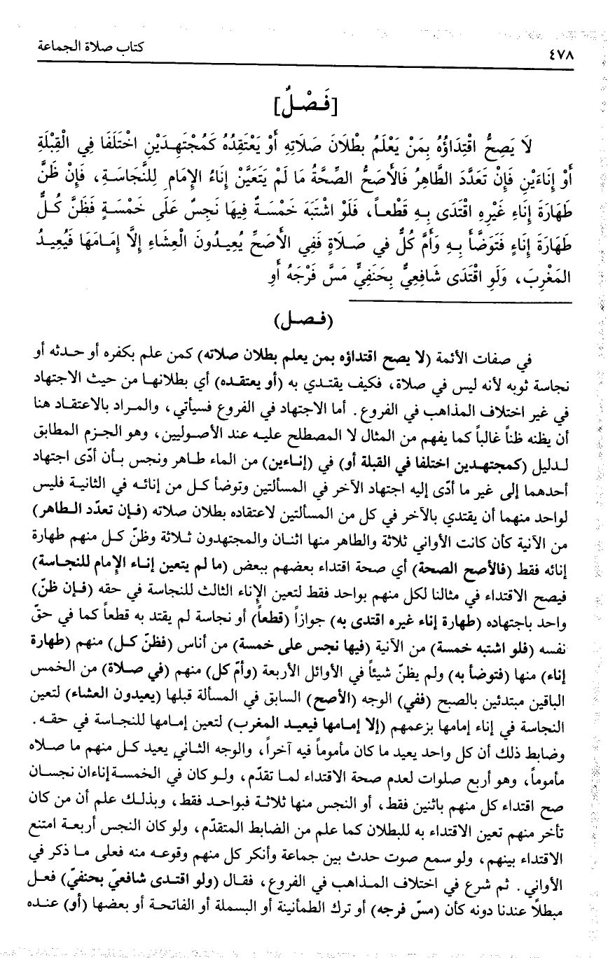فَصْلٌ لَا يَصِحُّ اقْتِدَاؤُهُ بِمَنْ يَعْلَمُ بُطْلَانَ صَلَاتِهِ أَوْ يَعْتَقِدُهُ كَمُجْتَهِدَيْنِ اخْتَلَفَا فِي الْقِبْلَةِ أَوْ إنَاءَيْنِ