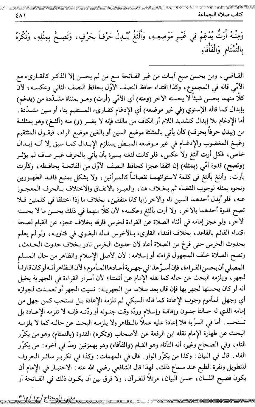 (وَتُكْرَهُ) الْقُدْوَةُ (بِالتَّمْتَامِ) وَهُوَ مَنْ يُكَرِّرُ التَّاءَ، وَفِي الصِّحَاحِ وَغَيْرِهِ أَنَّهُ التَّأْتَاءُ وَهُوَ الْقِيَاسُ (وَالْفَأْفَاءِ) وَهُوَ بِهَمْزَتَيْنِ وَمَدٍّ فِي آخِرِهِ: مَنْ يُكَرِّرُ الْفَاءَ. قَالَ فِي الْبَيَانِ: وَكَذَا مَنْ يُكَرِّرُ الْوَاوَ. قَالَ فِي الْمُهِمَّاتِ: وَكَذَا فِي تَكْرِيرِ سَائِرِ الْحُرُوفِ لِلتَّطْوِيلِ وَنَفْرَةِ الطَّبْعِ عِنْدَ سَمَاعِ ذَلِكَ، لِهَذَا قَالَ الشَّافِعِيُّ - رَضِيَ اللَّهُ عَنْهُ -: الِاخْتِيَارُ فِي الْإِمَامِ أَنْ يَكُونَ فَصِيحَ اللِّسَانِ، حَسَنَ الْبَيَانِ، مُرَتِّلًا لِلْقُرْآنِ، وَلَا فَرْقَ بَيْنَ أَنْ يَكُونَ ذَلِكَ فِي الْفَاتِحَةِ أَوْ