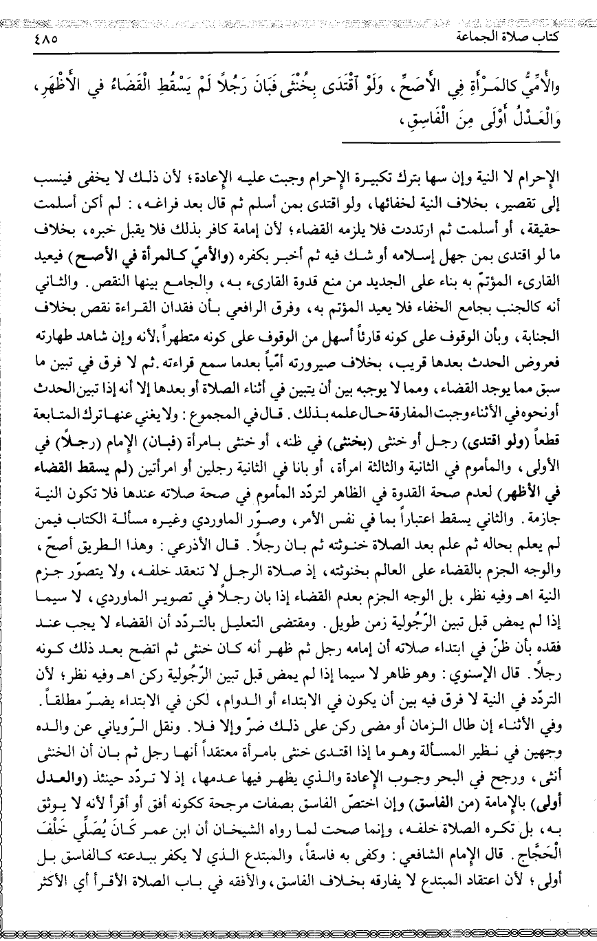 لِأَنَّ التَّرَدُّدَ فِي النِّيَّةِ لَا فَرْقَ فِيهِ بَيْنَ أَنْ يَكُونَ فِي الِابْتِدَاءِ أَوْ الدَّوَامِ، لَكِنْ فِي الِابْتِدَاءِ يَضُرُّ مُطْلَقًا. وَفِي الْأَثْنَاءِ إنْ طَالَ الزَّمَانُ أَوْ مَضَى رُكْنٌ عَلَى ذَلِكَ ضَرَّ وَإِلَّا فَلَا. وَنَقَلَ الرُّويَانِيُّ عَنْ وَالِدِهِ وَجْهَيْنِ فِي نَظِيرِ الْمَسْأَلَةِ وَهُوَ مَا إذَا اقْتَدَى خُنْثَى بِامْرَأَةٍ مُعْتَقِدًا أَنَّهَا رَجُلٌ ثُمَّ بَانَ أَنَّ الْخُنْثَى أُنْثَى، وَرَجَّحَ فِي الْبَحْرِ وُجُوبَ الْإِعَادَةِ وَاَلَّذِي يَظْهَرُ فِيهَا عَدَمُهَا، إذْ لَا تَرَدُّدَ حِينَئِذٍ (وَالْعَدْلُ أَوْلَى) بِالْإِمَامَةِ (مِنْ الْفَاسِقِ) وَإِنْ اخْتَصَّ الْفَاسِقُ بِصِفَاتٍ مُرَجِّحَةٍ كَكَوْنِهِ أَفْقَهَ أَوْ أَقْرَأَ لِأَنَّهُ لَا يُوثَقُ بِهِ، بَلْ تُكْرَهُ الصَّلَاةُ خَلْفَهُ، وَإِنَّمَا صَحَّتْ لِمَا رَوَاهُ الشَّيْخَانِ أَنَّ ابْنَ عُمَرَ كَانَ يُصَلِّي خَلْفَ الْحَجَّاجِ. قَالَ الْإِمَامُ الشَّافِعِيُّ: وَكَفَى بِهِ فَاسِقًا، وَالْمُبْتَدِعُ الَّذِي لَا يَكْفُرُ بِبِدْعَتِهِ كَالْفَاسِقِ بَلْ أَوْلَى؛ لِأَنَّ اعْتِقَادَ الْمُبْتَدِعِ لَا يُفَارِقُهُ بِخِلَافِ الْفَاسِقِ، وَالْأَفْقَهُ فِي بَابِ الصَّلَاةِ الْأَقْرَأُ أَيْ الْأَكْثَرُ