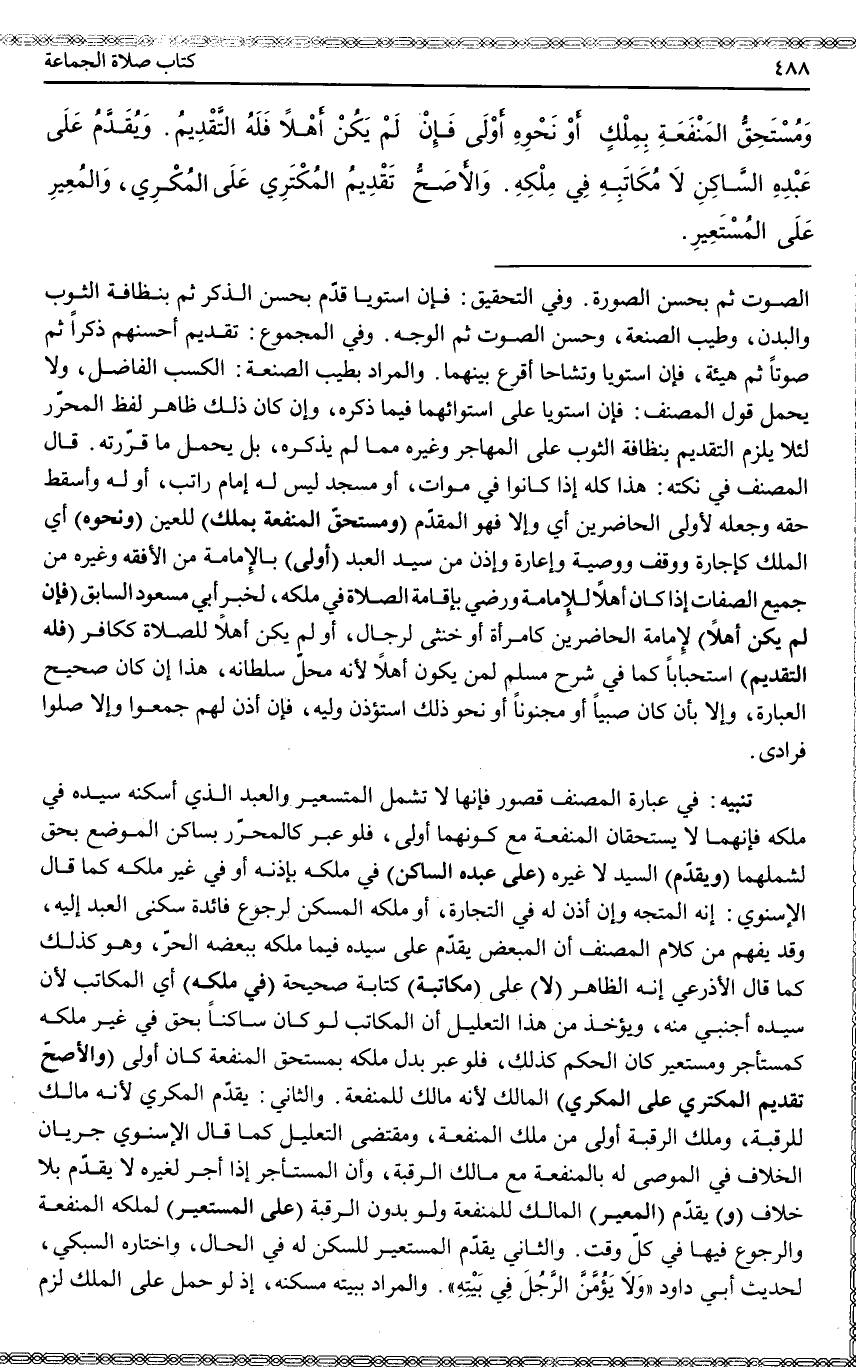 (وَمُسْتَحِقُّ الْمَنْفَعَةِ بِمِلْكٍ) لِلْعَيْنِ (أَوْ نَحْوِهِ) أَيْ الْمِلْكِ كَإِجَارَةٍ وَوَقْفٍ وَوَصِيَّةٍ وَإِعَارَةٍ وَإِذْنٍ مِنْ سَيِّدِ الْعَبْدِ (أَوْلَى) بِالْإِمَامَةِ مِنْ الْأَفْقَهِ وَغَيْرِهِ مِنْ جَمِيعِ الصِّفَاتِ إذَا كَانَ أَهْلًا لِلْإِمَامَةِ وَرَضِيَ بِإِقَامَةِ الصَّلَاةِ فِي مِلْكِهِ، لِخَبَرِ أَبِي مَسْعُودٍ السَّابِقِ (فَإِنْ لَمْ يَكُنْ أَهْلًا) لِإِمَامَةِ الْحَاضِرِينَ كَامْرَأَةٍ أَوْ خُنْثَى لِرِجَالٍ، أَوْ لَمْ يَكُنْ أَهْلًا لِلصَّلَاةِ كَكَافِرٍ (فَلَهُ التَّقْدِيمُ) اسْتِحْبَابًا كَمَا فِي شَرْحِ مُسْلِمٍ لِمَنْ يَكُونُ أَهْلًا لِأَنَّهُ مَحَلُّ سُلْطَانِهِ، هَذَا إنْ كَانَ صَحِيحَ الْعِبَارَةِ، وَإِلَّا بِأَنْ كَانَ صَبِيًّا أَوْ مَجْنُونًا أَوْ نَحْوَ ذَلِكَ اُسْتُؤْذِنَ وَلِيُّهُ، فَإِنْ أَذِنَ لَهُمْ جَمَعُوا وَإِلَّا صَلَّوْا فُرَادَى.