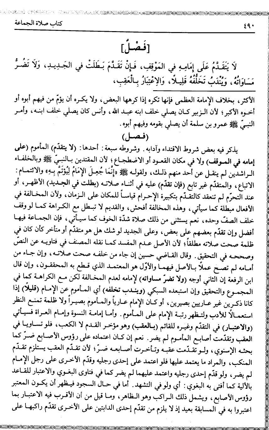 فَصْلُ لَا يَتَقَدَّمُ عَلَى إمَامِهِ فِي الْمَوْقِفِ، فَإِنْ تَقَدَّمَ بَطَلَتْ فِي الْجَدِيدِ، وَلَا تَضُرُّ مُسَاوَاتُهُ، وَيُنْدَبُ تَخَلُّفُهُ قَلِيلًا، وَالِاعْتِبَارُ بِالْعَقِبِ.