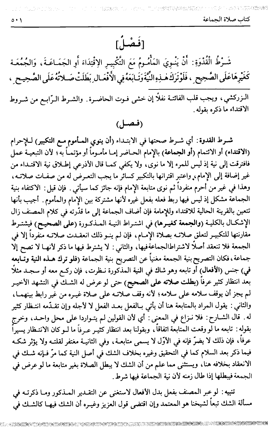 وَالشَّرْطُ الرَّابِعُ مِنْ شُرُوطِ الِاقْتِدَاءِ مَا ذَكَرَهُ بِقَوْلِهِ. (فَصْلٌ) شَرْطُ الْقُدْوَةِ: أَيْ شَرْطُ صِحَّتِهَا فِي الِابْتِدَاءِ (أَنْ يَنْوِيَ الْمَأْمُومُ مَعَ التَّكْبِيرِ) لِلْإِحْرَامِ (الِاقْتِدَاءَ) أَوْ الِائْتِمَامَ (أَوْ الْجَمَاعَةَ) بِالْإِمَامِ الْحَاضِرِ إمَّا مَأْمُومًا أَوْ مُؤْتَمًّا بِهِ؛ لِأَنَّ التَّبَعِيَّةَ عَمَلٌ فَافْتَقَرَتْ إلَى نِيَّةٍ إذْ لَيْسَ لِلْمَرْءِ إلَّا مَا نَوَى، وَلَا يَكْفِي كَمَا قَالَ الْأَذْرَعِيُّ إطْلَاقُ نِيَّةِ الِاقْتِدَاءِ مِنْ غَيْرِ إضَافَةٍ إلَى الْإِمَامِ، وَاعْتُبِرَ اقْتِرَانُهَا بِالتَّكْبِيرِ كَسَائِرِ مَا يَجِبُ التَّعَرُّضُ لَهُ مِنْ صِفَاتِ صَلَاتِهِ، وَهَذَا فِي غَيْرِ مَنْ أَحْرَمَ مُنْفَرِدًا ثُمَّ نَوَى مُتَابَعَةَ الْإِمَامِ فَإِنَّهُ جَائِزٌ كَمَا سَيَأْتِي.