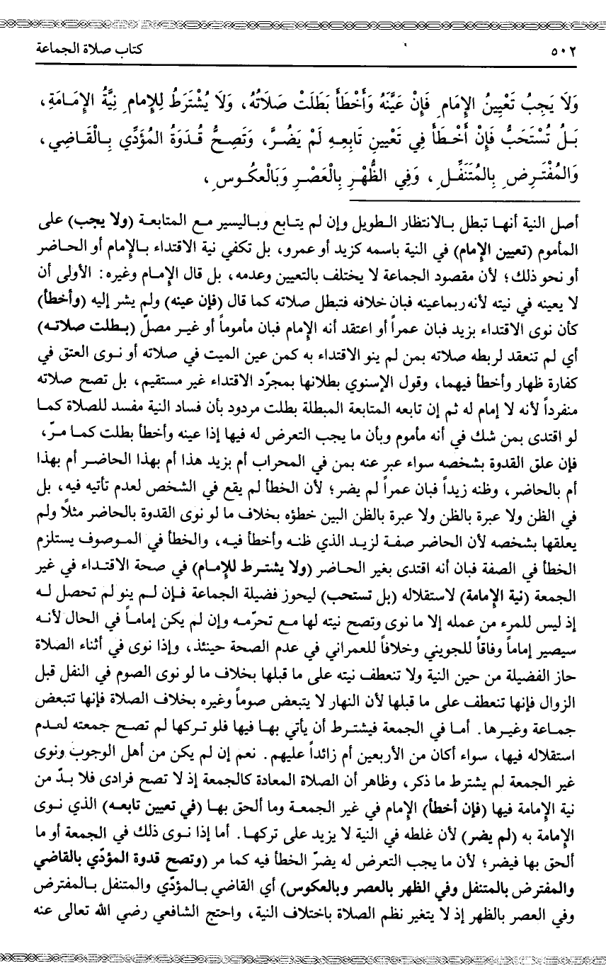 (وَلَا يَجِبُ) عَلَى الْمَأْمُومِ (تَعْيِينُ الْإِمَامِ) فِي النِّيَّةِ بِاسْمِهِ كَزَيْدٍ أَوْ عَمْرٍو، بَلْ تَكْفِي نِيَّةُ الِاقْتِدَاءِ بِالْإِمَامِ أَوْ الْحَاضِرِ أَوْ نَحْوِ ذَلِكَ؛ لِأَنَّ مَقْصُودَ الْجَمَاعَةِ لَا يَخْتَلِفُ بِالتَّعْيِينِ وَعَدَمِهِ، بَلْ قَالَ الْإِمَامُ وَغَيْرُهُ: الْأَوْلَى أَنْ لَا يُعَيِّنَهُ فِي نِيَّتِهِ لِأَنَّهُ رُبَّمَا عَيَّنَهُ فَبَانَ خِلَافُهُ فَتَبْطُلُ صَلَاتُهُ كَمَا قَالَ (فَإِنْ عَيَّنَهُ) وَلَمْ يُشِرْ إلَيْهِ (وَأَخْطَأَ) كَأَنْ نَوَى الِاقْتِدَاءَ بِزَيْدٍ فَبَانَ عَمْرًا أَوْ اعْتَقَدَ أَنَّهُ الْإِمَامُ فَبَانَ مَأْمُومًا أَوْ غَيْرَ مُصَلٍّ (بَطَلَتْ صَلَاتُهُ) أَيْ لَمْ تَنْعَقِدْ لِرَبْطِهِ صَلَاتَهُ بِمَنْ لَمْ يَنْوِ الِاقْتِدَاءَ بِهِ كَمَنْ عَيَّنَ الْمَيِّتَ فِي صَلَاتِهِ أَوْ نَوَى الْعِتْقَ فِي كَفَّارَةِ ظِهَارٍ وَأَخْطَأَ فِيهِمَا، وَقَوْلُ الْإِسْنَوِيِّ بُطْلَانُهَا بِمُجَرَّدِ الِاقْتِدَاءِ غَيْرُ مُسْتَقِيمٍ، بَلْ تَصِحُّ صَلَاتُهُ مُنْفَرِدًا لِأَنَّهُ لَا إمَامَ لَهُ ثُمَّ إنْ تَابَعَهُ الْمُتَابَعَةَ الْمُبْطِلَةَ بَطَلَتْ مَرْدُودٌ؛ بِأَنَّ فَسَادَ النِّيَّةِ مُفْسِدٌ لِلصَّلَاةِ كَمَا لَوْ اقْتَدَى بِمَنْ شَكَّ فِي أَنَّهُ مَأْمُومٌ وَبِأَنَّ مَا يَجِبُ التَّعَرُّضُ لَهُ فِيهَا إذَا عَيَّنَهُ وَأَخْطَأَ بَطَلَتْ كَمَا مَرَّ، فَإِنْ عَلَّقَ الْقُدْوَةَ بِشَخْصِهِ سَوَاءٌ عَبَّرَ عَنْهُ بِمَنْ فِي الْمِحْرَابِ أَمْ بِزَيْدٍ هَذَا أَمْ بِهَذَا الْحَاضِرِ أَمْ بِهَذَا أَمْ بِالْحَاضِرِ، وَظَنَّهُ زَيْدًا فَبَانَ عَمْرًا لَمْ يَضُرَّ؛ لِأَنَّ الْخَطَأَ لَمْ يَقَعْ فِي الشَّخْصِ لِعَدَمِ تَأَتِّيهِ فِيهِ، بَلْ فِي الظَّنِّ وَلَا عِبْرَةَ بِالظَّنِّ وَلَا عِبْرَةَ بِالظَّنِّ الْبَيِّنِ خَطَؤُهُ بِخِلَافِ مَا لَوْ نَوَى الْقُدْوَةَ بِالْحَاضِرِ مَثَلًا وَلَمْ يُعَلِّقْهَا بِشَخْصِهِ لِأَنَّ الْحَاضِرَ صِفَةٌ لِزَيْدٍ الَّذِي ظَنَّهُ وَأَخْطَأَ فِيهِ، وَالْخَطَأُ فِي الْمَوْصُوفِ يَسْتَلْزِمُ الْخَطَأَ فِي الصِّفَةِ فَبَانَ أَنَّهُ اقْتَدَى بِغَيْرِ الْحَاضِرِ.