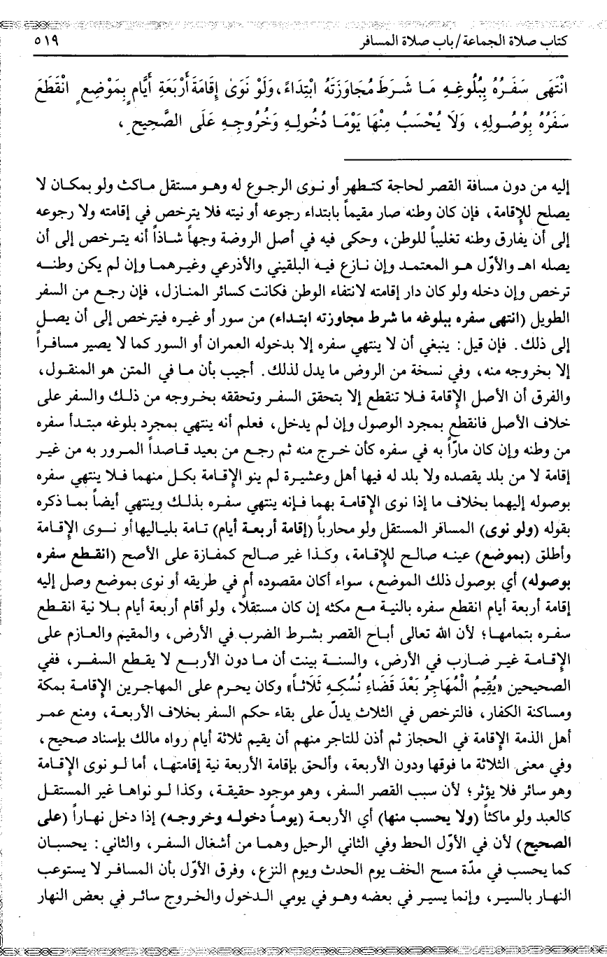 أُجِيبَ بِأَنَّ مَا فِي الْمَتْنِ هُوَ الْمَنْقُولُ، وَالْفَرْقُ أَنَّ الْأَصْلَ الْإِقَامَةُ فَلَا تَنْقَطِعُ إلَّا بِتَحَقُّقِ السَّفَرِ وَتَحَقُّقُهُ بِخُرُوجِهِ مِنْ ذَلِكَ وَالسَّفَرُ عَلَى خِلَافِ الْأَصْلِ فَانْقَطَعَ بِمُجَرَّدِ الْوُصُولِ وَإِنْ لَمْ يَدْخُلْ، فَعُلِمَ أَنَّهُ يَنْتَهِي بِمُجَرَّدِ بُلُوغِهِ مُبْتَدَأَ سَفَرِهِ مِنْ وَطَنِهِ وَإِنْ كَانَ مَارًّا بِهِ فِي سَفَرِهِ كَأَنْ خَرَجَ مِنْهُ ثُمَّ رَجَعَ مِنْ بَعِيدٍ قَاصِدًا الْمُرُورَ بِهِ مِنْ غَيْرِ إقَامَةٍ لَا مِنْ بَلَدٍ يَقْصِدُهُ وَلَا بَلَدٍ لَهُ فِيهَا أَهْلٌ وَعَشِيرَةٌ لَمْ يَنْوِ الْإِقَامَةَ بِكُلٍّ مِنْهُمَا فَلَا يَنْتَهِي سَفَرُهُ بِوُصُولِهِ إلَيْهِمَا بِخِلَافِ مَا إذَا نَوَى الْإِقَامَةَ بِهِمَا فَإِنَّهُ يَنْتَهِي سَفَرُهُ بِذَلِكَ وَيَنْتَهِي أَيْضًا بِمَا ذَكَرَهُ بِقَوْلِهِ.
