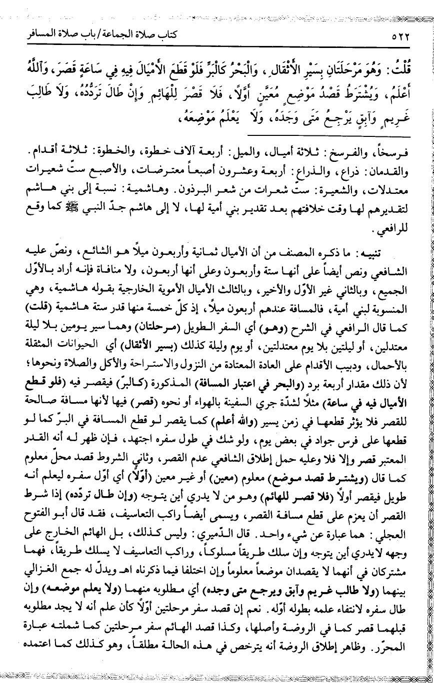 ـــــــــــــــــــــــــــــQفَرْسَخًا، وَالْفَرْسَخُ: ثَلَاثَةُ أَمْيَالٍ، وَالْمِيلُ: أَرْبَعَةُ آلَافِ خَطْوَةٍ، وَالْخَطْوَةُ ثَلَاثَةُ أَقْدَامٍ. وَالْقَدَمَانِ: ذِرَاعٌ، وَالذِّرَاعُ: أَرْبَعَةٌ وَعِشْرُونَ أُصْبُعًا مُعْتَرِضَاتٍ، وَالْأُصْبُعُ سِتُّ شُعَيْرَاتٍ مُعْتَدِلَاتٍ، وَالشُّعَيْرَةُ: سِتُّ شَعَرَاتٍ مِنْ شَعْرِ الْبِرْذَوْنِ. وَهَاشِمِيَّةٌ: نِسْبَةٌ إلَى بَنِي هَاشِمٍ لِتَقْدِيرِهِمْ لَهَا وَقْتَ خِلَافَتِهِمْ بَعْدَ تَقْدِيرِ بَنِي أُمَيَّةَ لَهَا، لَا إلَى هَاشِمٍ جَدِّ النَّبِيِّ - صَلَّى اللَّهُ عَلَيْهِ وَسَلَّمَ - كَمَا وَقَعَ لِلرَّافِعِيِّ. تَنْبِيهٌ: مَا ذَكَرَهُ الْمُصَنِّفُ مِنْ أَنَّ الْأَمْيَالَ ثَمَانِيَةٌ وَأَرْبَعُونَ مِيلًا هُوَ الشَّائِعُ، وَنَصَّ عَلَيْهِ الشَّافِعِيُّ وَنَصَّ أَيْضًا عَلَى أَنَّهَا سِتَّةٌ وَأَرْبَعُونَ وَعَلَى أَنَّهَا أَرْبَعُونَ، وَلَا مُنَافَاةَ فَإِنَّهُ أَرَادَ بِالْأَوَّلِ الْجَمِيعَ، وَبِالثَّانِي غَيْرَ الْأَوَّلِ وَالْأَخِيرِ، وَبِالثَّالِثِ الْأَمْيَالَ الْأُمَوِيَّةَ الْخَارِجِيَّةَ بِقَوْلِهِ هَاشِمِيَّةٍ، وَهِيَ الْمَنْسُوبَةُ لِبَنِي أُمَيَّةَ، فَالْمَسَافَةُ عِنْدَهُمْ أَرْبَعُونَ مِيلًا، إذْ كُلُّ خَمْسَةٍ مِنْهَا قَدْرُ سِتَّةٍ هَاشِمِيَّةٍ.