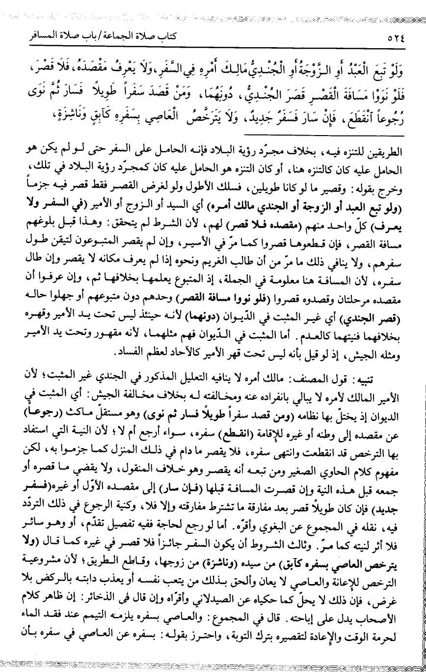 (وَلَوْ تَبِعَ الْعَبْدُ أَوْ الزَّوْجَةُ أَوْ الْجُنْدِيُّ مَالِكَ أَمْرِهِ) أَيْ السَّيِّدَ أَوْ الزَّوْجَ أَوْ الْأَمِيرَ (فِي السَّفَرِ وَلَا يَعْرِفُ) كُلُّ وَاحِدٍ مِنْهُمْ (مَقْصِدَهُ فَلَا قَصْرَ) لَهُمْ، لِأَنَّ الشَّرْطَ لَمْ يَتَحَقَّقْ: وَهَذَا قَبْلَ بُلُوغِهِمْ مَسَافَةَ الْقَصْرِ، فَإِنْ قَطَعُوهَا قَصَرُوا كَمَا مَرَّ فِي الْأَسِيرِ، وَإِنْ لَمْ يَقْصُرْ الْمَتْبُوعُونَ لِتَيَقُّنِ طُولِ سَفَرِهِمْ، وَلَا يُنَافِي ذَلِكَ مَا مَرَّ مِنْ أَنَّ طَالِبَ الْغَرِيمِ وَنَحْوَهُ إذَا لَمْ يَعْرِفْ مَكَانَهُ لَا يَقْصُرُ وَإِنْ طَالَ سَفَرُهُ، لِأَنَّ الْمَسَافَةَ هُنَا مَعْلُومَةٌ فِي الْجُمْلَةِ، إذْ الْمَتْبُوعُ يَعْلَمُهَا بِخِلَافِهَا ثُمَّ، وَإِنْ عَرَفُوا أَنَّ مَقْصِدَهُ مَرْحَلَتَانِ وَقَصَدُوهُ قَصَرُوا (فَلَوْ نَوَوْا مَسَافَةَ الْقَصْرِ) وَحْدَهُمْ دُونَ مَتْبُوعِهِمْ وَجَهِلُوا (قَصَرَ الْجُنْدِيُّ) أَيْ غَيْرُ الْمُثْبَتِ فِي الدِّيوَانِ (دُونَهُمَا) لِأَنَّهُ حِينَئِذٍ لَيْسَ تَحْتَ يَدِ الْأَمِيرِ وَقَهْرِهِ بِخِلَافِهِمَا فَنِيَّتُهُمَا كَالْعَدَمِ. أَمَّا الْمُثْبَتُ فِي الدِّيوَانِ فَهُوَ مِثْلُهُمَا، لِأَنَّهُ مَقْهُورٌ وَتَحْتَ يَدِ الْأَمِيرِ وَمِثْلُهُ الْجَيْشُ، إذْ لَوْ قِيلَ بِأَنَّهُ لَيْسَ تَحْتَ قَهْرِ الْأَمِيرِ كَالْآحَادِ لِعِظَمِ الْفَسَادِ. تَنْبِيهٌ قَوْلُ الْمُصَنِّفِ: مَالِكَ أَمْرِهِ لَا يُنَافِيهِ التَّعْلِيلُ الْمَذْكُورُ فِي الْجُنْدِيِّ غَيْرِ الْمُثْبَتِ؛ لِأَنَّ الْأَمِيرَ الْمَالِكَ لِأَمْرِهِ لَا يُبَالِي بِانْفِرَادِهِ عَنْهُ وَمُخَالَفَتِهِ لَهُ بِخِلَافِ مُخَالَفَةِ الْجَيْشِ: أَيْ الْمُثْبَتِ فِي الدِّيوَانِ إذْ يَخْتَلُّ بِهَا نِظَامُهُ.