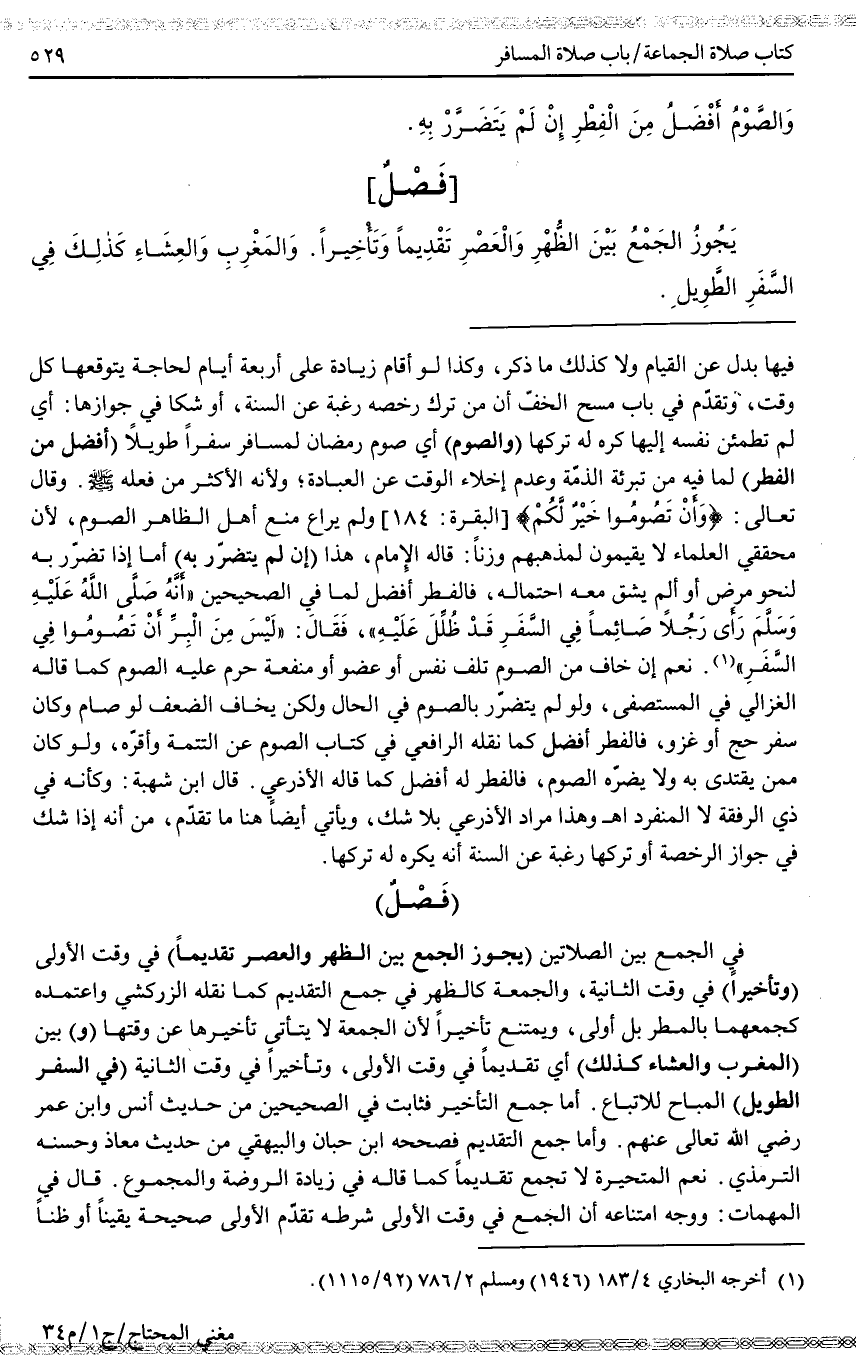 (فَصْلٌ) فِي الْجَمْعِ بَيْنَ الصَّلَاتَيْنِ (يَجُوزُ الْجَمْعُ بَيْنَ الظُّهْرِ وَالْعَصْرِ تَقْدِيمًا) فِي وَقْتِ الْأُولَى (وَتَأْخِيرًا) فِي وَقْتِ الثَّانِيَةِ، وَالْجُمُعَةُ كَالظُّهْرِ فِي جَمْعِ التَّقْدِيمِ كَمَا نَقَلَهُ الزَّرْكَشِيُّ وَاعْتَمَدَهُ كَجَمْعِهِمَا بِالْمَطَرِ بَلْ أَوْلَى، وَيُمْتَنَعُ تَأْخِيرًا لِأَنَّ الْجُمُعَةَ لَا يَتَأَتَّى تَأْخِيرُهَا عَنْ وَقْتِهَا (وَ) بَيْنَ (الْمَغْرِبِ وَالْعِشَاءِ كَذَلِكَ) أَيْ تَقْدِيمًا فِي وَقْتِ الْأُولَى، وَتَأْخِيرًا فِي وَقْتِ الثَّانِيَةِ (فِي السَّفَرِ الطَّوِيلِ) الْمُبَاحِ لِلِاتِّبَاعِ. أَمَّا جَمْعُ التَّأْخِيرِ فَثَابِتٌ فِي الصَّحِيحَيْنِ مِنْ حَدِيثِ أَنَسٍ وَابْنِ عُمَرَ - رَضِيَ اللَّهُ تَعَالَى عَنْهُمْ -. وَأَمَّا جَمْعُ التَّقْدِيمِ فَصَحَّحَهُ ابْنُ حِبَّانَ وَالْبَيْهَقِيُّ مِنْ حَدِيثِ مُعَاذٍ وَحَسَّنَهُ التِّرْمِذِيُّ. .