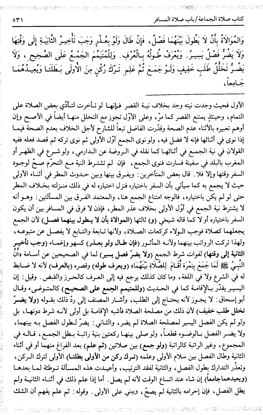 ـــــــــــــــــــــــــــــQالْأَوَّلِ فَحَيْثُ وُجِدَتْ نِيَّتُهُ وُجِدَ بِخِلَافِ نِيَّةِ الْقَصْرِ فَإِنَّهَا لَوْ تَأَخَّرَتْ لَتَأَدَّى بَعْضُ الصَّلَاةِ عَلَى التَّمَامِ، وَحِينَئِذٍ يَمْتَنِعُ الْقَصْرُ كَمَا مَرَّ، وَعَلَى الْأَوَّلِ تَجُوزُ مَعَ التَّحَلُّلِ مِنْهَا أَيْضًا فِي الْأَصَحِّ وَإِنْ أَوْهَمَ تَعْبِيرُهُ بِالْأَثْنَاءِ عَدَمَ الصِّحَّةِ وَقَدَّرْت الْفَاضِلَ تَبَعًا لِلشَّارِحِ لِأَجْلِ الْخِلَافِ بِعَدَمِ الصِّحَّةِ فِيمَا إذَا نَوَى فِي أَثْنَائِهَا فَإِنَّهُ لَا فَضْلَ فِيهِ، وَلَوْ نَوَى الْجَمْعَ أَوَّلَ الْأُولَى ثُمَّ نَوَى تَرْكَهُ ثُمَّ قَصَدَ فِعْلَهُ فَفِيهِ الْقَوْلَانِ فِي نِيَّةِ الْجَمْعِ فِي أَثْنَائِهَا كَمَا نَقَلَهُ فِي الرَّوْضَةِ عَنْ الدَّارِمِيِّ، وَلَوْ شَرَعَ فِي الظُّهْرِ أَوْ الْمَغْرِبِ بِالْبَلَدِ فِي سَفِينَةٍ فَسَارَتْ فَنَوَى الْجَمْعَ، فَإِنْ لَمْ تُشْتَرَطُ النِّيَّةُ مَعَ التَّحَرُّمِ صَحَّ لِوُجُودِ السَّفَرِ وَقْتَهَا وَإِلَّا فَلَا. قَالَ بَعْضُ الْمُتَأَخِّرِينَ: وَيُفَرَّقُ بَيْنَهَا وَبَيْنَ حُدُوثِ الْمَطَرِ فِي أَثْنَاءِ الْأُولَى حَيْثُ لَا يُجْمَعُ بِهِ كَمَا سَيَأْتِي بِأَنَّ السَّفَرَ بِاخْتِيَارِهِ فَنَزَلَ اخْتِيَارُهُ لَهُ فِي ذَلِكَ مَنْزِلَتَهُ بِخِلَافِ الْمَطَرِ حَتَّى لَوْ لَمْ يَكُنْ بِاخْتِيَارِهِ، فَالْوَجْهُ امْتِنَاعُ الْجَمْعِ هُنَا، وَالْمُعْتَمَدُ الْفَرْقُ بَيْنَ الْمَسْأَلَتَيْنِ: وَهُوَ أَنَّهُ لَا يُشْتَرَطُ نِيَّةُ الْجَمْعِ فِي أَوَّلِ الْأُولَى بِخِلَافِ عُذْرِ الْمَطَرِ، فَإِذَنْ لَا فَرْقَ فِي الْمُسَافِرِ بَيْنَ أَنْ يَكُونَ السَّفَرُ بِاخْتِيَارِهِ أَوْ لَا كَمَا قَالَهُ شَيْخِي (وَ) ثَالِثُهَا (الْمُوَالَاةُ بِأَنْ لَا يَطُولَ بَيْنَهُمَا فَصْلٌ) لِأَنَّ الْجَمْعَ يَجْعَلُهُمَا كَصَلَاةٍ فَوَجَبَ الْوَلَاءُ كَرَكَعَاتِ الصَّلَاةِ، وَلِأَنَّهَا تَابِعَةٌ وَالتَّابِعُ لَا يُفْصَلُ عَنْ مَتْبُوعِهِ، وَلِهَذَا تُرِكَتْ الرَّوَاتِبُ بَيْنَهُمَا وَلِأَنَّهُ الْمَأْثُورُ (فَإِنْ طَالَ وَلَوْ بِعُذْرٍ) كَسَهْوٍ وَإِغْمَاءٍ (وَجَبَ تَأْخِيرُ الثَّانِيَةِ إلَى وَقْتِهَا) لِفَوَاتِ شَرْطِ الْجَمْعِ (وَلَا يَضُرُّ فَصْلٌ يَسِيرٌ) لِمَا فِي الصَّحِيحَيْنِ عَنْ أُسَامَةَ «أَنَّ النَّبِيَّ - صَلَّى اللَّهُ عَلَيْهِ وَسَلَّمَ - لَمَّا جَمَعَ بِنَمِرَةَ أَقَامَ لِلصَّلَاةِ بَيْنَهُمَا» (وَيُعْرَفُ طُولُهُ) وَقِصَرُهُ (بِالْعُرْفِ) لِأَنَّهُ لَا ضَابِطَ لَهُ فِي الشَّرْعِ وَلَا فِي اللُّغَةِ، وَمَا كَانَ كَذَلِكَ يُرْجَعُ فِيهِ إلَى الْعُرْفِ كَالْحِرْزِ وَالْقَبْضِ. وَقِيلَ: إنَّ الْيَسِيرَ يُقَدَّرُ بِالْإِقَامَةِ كَمَا فِي الْحَدِيثِ.