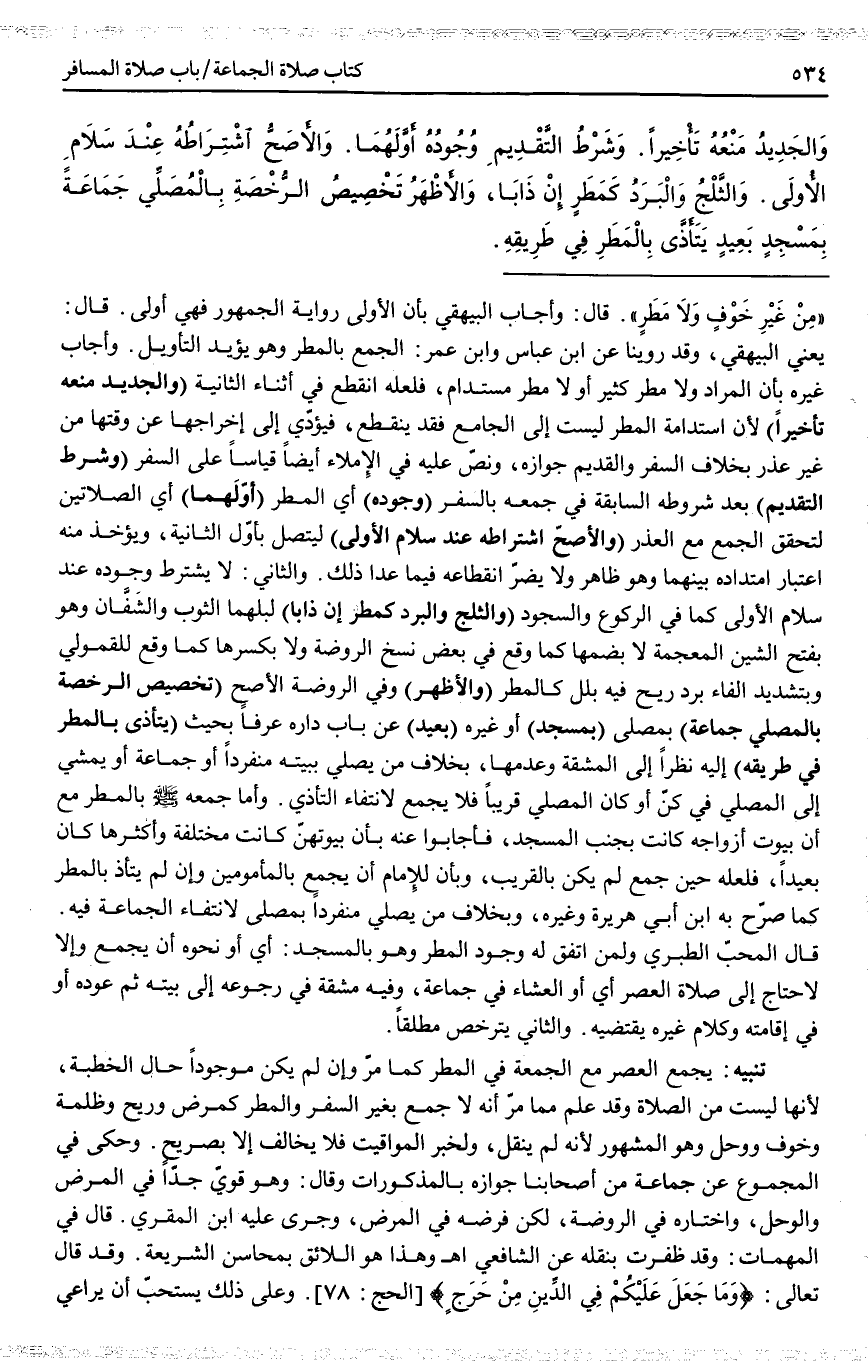 ـــــــــــــــــــــــــــــQ «مِنْ غَيْرِ خَوْفٍ وَلَا مَطَرٍ» . قَالَ: وَأَجَابَ الْبَيْهَقِيُّ بِأَنَّ الْأُولَى رِوَايَةُ الْجُمْهُورِ فَهِيَ أَوْلَى. قَالَ: يَعْنِي الْبَيْهَقِيَّ، وَقَدْ رَوَيْنَا عَنْ ابْنِ عَبَّاسٍ وَابْنِ عُمَرَ: الْجَمْعَ بِالْمَطَرِ وَهُوَ يُؤَيِّدُ التَّأْوِيلَ.