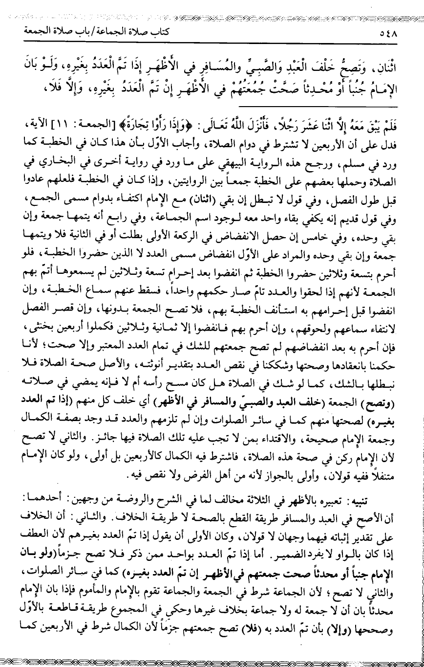 ـــــــــــــــــــــــــــــQ «أَنَّهُمْ انْفَضُّوا عَنْ النَّبِيِّ - صَلَّى اللَّهُ عَلَيْهِ وَسَلَّمَ - فَلَمْ يَبْقَ مَعَهُ إلَّا اثْنَا عَشَرَ رَجُلًا، فَأَنْزَلَ اللَّهُ تَعَالَى: {وَإِذَا رَأَوْا تِجَارَةً} [الجمعة: 11] الْجُمُعَةَ الْآيَةَ» ، فَدَلَّ عَلَى أَنَّ الْأَرْبَعِينَ لَا تُشْتَرَطُ فِي دَوَامِ الصَّلَاةِ.