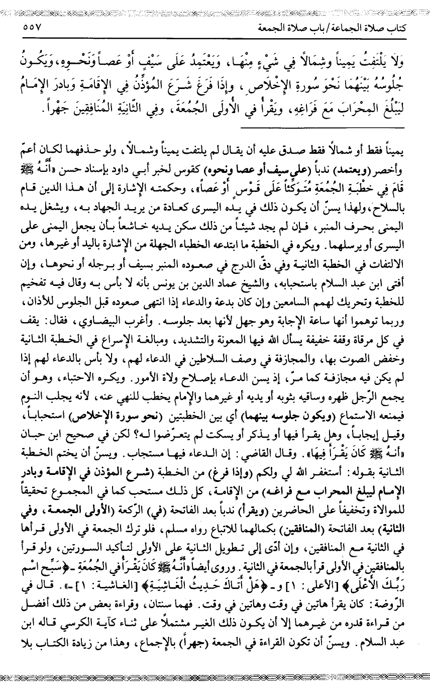 وَيُكْرَهُ فِي الْخُطْبَةِ مَا ابْتَدَعَهُ الْخُطَبَاءُ الْجَهَلَةُ مِنْ الْإِشَارَةِ بِالْيَدِ أَوْ غَيْرِهَا، وَمِنْ الِالْتِفَاتِ فِي الْخُطْبَةِ الثَّانِيَةِ وَفِي دَقِّ الدَّرَجِ فِي صُعُودِهِ الْمِنْبَرَ بِسَيْفٍ أَوْ بِرِجْلِهِ أَوْ نَحْوِهَا، وَإِنْ أَفْتَى ابْنُ عَبْدِ السَّلَامِ بِاسْتِحْبَابِهِ، وَالشَّيْخُ عِمَادُ الدِّينِ بْنُ يُونُسَ بِأَنَّهُ لَا بَأْسَ بِهِ وَقَالَ فِيهِ تَفْخِيمٌ لِلْخُطْبَةِ وَتَحْرِيكٌ لِهِمَمِ السَّامِعِينَ وَإِنْ كَانَ بِدْعَةً وَالدُّعَاءُ إذَا انْتَهَى صُعُودُهُ قَبْلَ الْجُلُوسِ لِلْأَذَانِ، وَرُبَّمَا تَوَهَّمُوا أَنَّهَا سَاعَةُ الْإِجَابَةِ وَهُوَ جَهْلٌ لِأَنَّهَا بَعْدَ جُلُوسِهِ. وَأَغْرَبَ الْبَيْضَاوِيُّ، فَقَالَ: يَقِفُ فِي كُلِّ مِرْقَاةٍ وَقْفَةً خَفِيفَةً يَسْأَلُ اللَّهَ فِيهَا الْمَعُونَةَ وَالتَّشْدِيدَ، وَمُبَالَغَةَ الْإِسْرَاعِ فِي الْخُطْبَةِ الثَّانِيَةِ وَخَفْضِ الصَّوْتِ بِهَا، وَالْمُجَازَفَةِ فِي وَصْفِ السَّلَاطِينَ فِي الدُّعَاءِ لَهُمْ، وَلَا بَأْسَ بِالدُّعَاءِ لَهُمْ إذَا لَمْ يَكُنْ فِيهِ مُجَازَفَةٌ كَمَا مَرَّ، إذْ يُسَنُّ الدُّعَاءُ بِإِصْلَاحِ وُلَاةِ الْأُمُورِ.