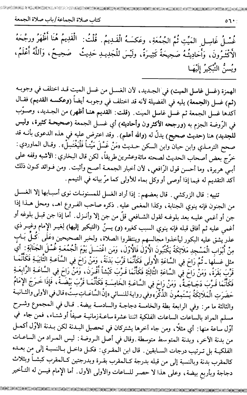 ثُمَّ الْجُمُعَةِ، وَعَكْسُهُ الْقَدِيمُ. قُلْت: الْقَدِيمُ هُنَا أَظْهَرُ وَرَجَّحَهُ الْأَكْثَرُونَ، وَأَحَادِيثُهُ صَحِيحَةٌ كَثِيرَةٌ، وَلَيْسَ لِلْجَدِيدِ حَدِيثٌ صَحِيحٌ، وَاَللَّهُ أَعْلَمُ.