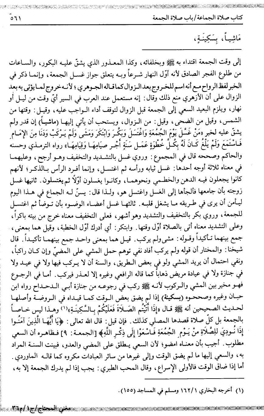 وَيُسْتَحَبُّ أَنْ يَأْتِيَ إلَيْهَا (مَاشِيًا) إنْ قَدَرَ وَلَمْ يَشُقَّ عَلَيْهِ لِخَبَرِ «مَنْ غَسَّلَ يَوْمَ الْجُمُعَةِ وَاغْتَسَلَ وَبَكَّرَ وَابْتَكَرَ وَمَشَى وَلَمْ يَرْكَبْ وَدَنَا مِنْ الْإِمَامِ فَاسْتَمَعَ وَلَمْ يَلْغُ كَانَ لَهُ بِكُلِّ خُطْوَةٍ عَمَلُ سَنَةٍ أَجْرُ صِيَامِهَا وَقِيَامِهَا» رَوَاهُ التِّرْمِذِيُّ وَحَسَّنَهُ وَالْحَاكِمُ وَصَحَّحَهُ قَالَ فِي الْمَجْمُوعِ: وَرُوِيَ غَسَّلَ بِالتَّشْدِيدِ وَالتَّخْفِيفِ وَهُوَ أَرْجَحُ، وَعَلَيْهِمَا فِي مَعْنَاهُ ثَلَاثَةُ أَوْجُهٍ أَحَدُهَا: غَسَلَ ثِيَابَهُ وَرَأْسَهُ ثُمَّ اغْتَسَلَ، وَإِنَّمَا أَفْرَدَ الرَّأْسَ بِالذِّكْرِ؛ لِأَنَّهُمْ كَانُوا يَجْعَلُونَ فِيهِ الدُّهْنَ وَالْخِطْمِيَّ وَنَحْوَهُمَا، وَكَانُوا يَغْسِلُونَ أَوَّلًا ثُمَّ يَغْتَسِلُونَ. ثَانِيهَا غَسَّلَ زَوْجَتَهُ بِأَنْ جَامَعَهَا فَأَلْجَأَهَا إلَى الْغُسْلِ وَاغْتَسَلَ هُوَ، وَلِذَا قَالَ: يُسَنُّ لَهُ الْجِمَاعُ فِي هَذَا الْيَوْمِ لِيَأْمَنَ أَنْ يَرَى فِي طَرِيقِهِ مَا يُشْغِلُ قَلْبَهُ. ثَالِثُهَا غَسَلَ أَعْضَاءَ الْوُضُوءِ بِأَنْ تَوَضَّأَ ثُمَّ اغْتَسَلَ لِلْجُمُعَةِ، وَرُوِيَ بَكَرَ بِالتَّخْفِيفِ وَالتَّشْدِيدِ وَهُوَ أَشْهَرُ، فَعَلَى التَّخْفِيفِ مَعْنَاهُ خَرَجَ مِنْ بَيْتِهِ بَاكِرًا، وَعَلَى التَّشْدِيدِ مَعْنَاهُ أَتَى بِالصَّلَاةِ أَوَّلَ وَقْتِهَا. وَابْتَكَرَ: أَيْ أَدْرَكَ أَوَّلَ الْخُطْبَةِ، وَقِيلَ هُمَا بِمَعْنًى، جَمَعَ بَيْنَهُمَا تَأْكِيدًا وَقَوْلُهُ: مَشَى وَلَمْ يَرْكَبْ. قِيلَ هُمَا بِمَعْنًى وَاحِدٍ جَمَعَ بَيْنَهُمَا تَأْكِيدًا. قَالَ شَيْخُنَا: وَالْمُخْتَارُ أَنَّ قَوْلَهُ وَلَمْ يَرْكَبْ أَفَادَ نَفْيَ تَوَهُّمِ حَمْلِ الْمَشْيِ عَلَى الْمُضِيِّ وَإِنْ كَانَ رَاكِبًا، وَنَفْيَ احْتِمَالِ أَنْ يُرِيدَ الْمَشْيَ وَلَوْ فِي بَعْضِ الطَّرِيقِ، وَالسُّنَّةُ أَنْ لَا يَرْكَبَ فِيهَا وَلَا فِي عِيدٍ وَلَا فِي جِنَازَةٍ وَلَا فِي عِيَادَةِ مَرِيضٍ ذَهَابًا كَمَا قَالَهُ الرَّافِعِيُّ وَغَيْرُهُ إلَّا لِعُذْرٍ فَيَرْكَبُ. أَمَّا فِي الرُّجُوعِ فَهُوَ مُخَيَّرٌ بَيْنَ الْمَشْيِ وَالرُّكُوبِ لِأَنَّهُ - صَلَّى اللَّهُ عَلَيْهِ وَسَلَّمَ - «رَكِبَ فِي رُجُوعِهِ مِنْ جِنَازَةِ أَبِي الدَّحْدَاحِ» رَوَاهُ ابْنُ حِبَّانَ وَغَيْرُهُ وَصَحَّحُوهُ (بِسَكِينَةٍ) إذَا لَمْ يَضِقْ بَعْضُ الْوَقْتِ كَمَا قَيَّدَاهُ فِي الرَّوْضَةِ وَأَصْلُهَا لِحَدِيثِ الصَّحِيحَيْنِ أَنَّهُ - صَلَّى اللَّهُ عَلَيْهِ وَسَلَّمَ - قَالَ «إذَا أَتَيْتُمْ الصَّلَاةَ فَعَلَيْكُمْ بِالسَّكِينَةِ» (1) وَهَذَا لَيْسَ خَاصًّا بِالْجُمُعَةِ بَلْ كُلُّ صَلَاةٍ قَصَدَهَا الْمُصَلِّي كَذَلِكَ فَإِنْ قِيلَ: قَالَ اللَّهُ تَعَالَى: {يَا أَيُّهَا الَّذِينَ آمَنُوا إِذَا نُودِيَ لِلصَّلاةِ مِنْ يَوْمِ الْجُمُعَةِ فَاسْعَوْا إِلَى ذِكْرِ اللَّهِ} [الجمعة: 9] [الْجُمُعَةَ] فَظَاهِرُهُ أَنَّ السَّعْيَ مَطْلُوبٌ.
