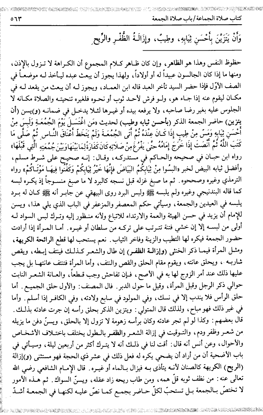 وَأَنْ يَتَزَيَّنَ بِأَحْسَنِ ثِيَابِهِ، وَطِيبٍ، وَإِزَالَةِ الظُّفُرِ وَالرِّيحِ