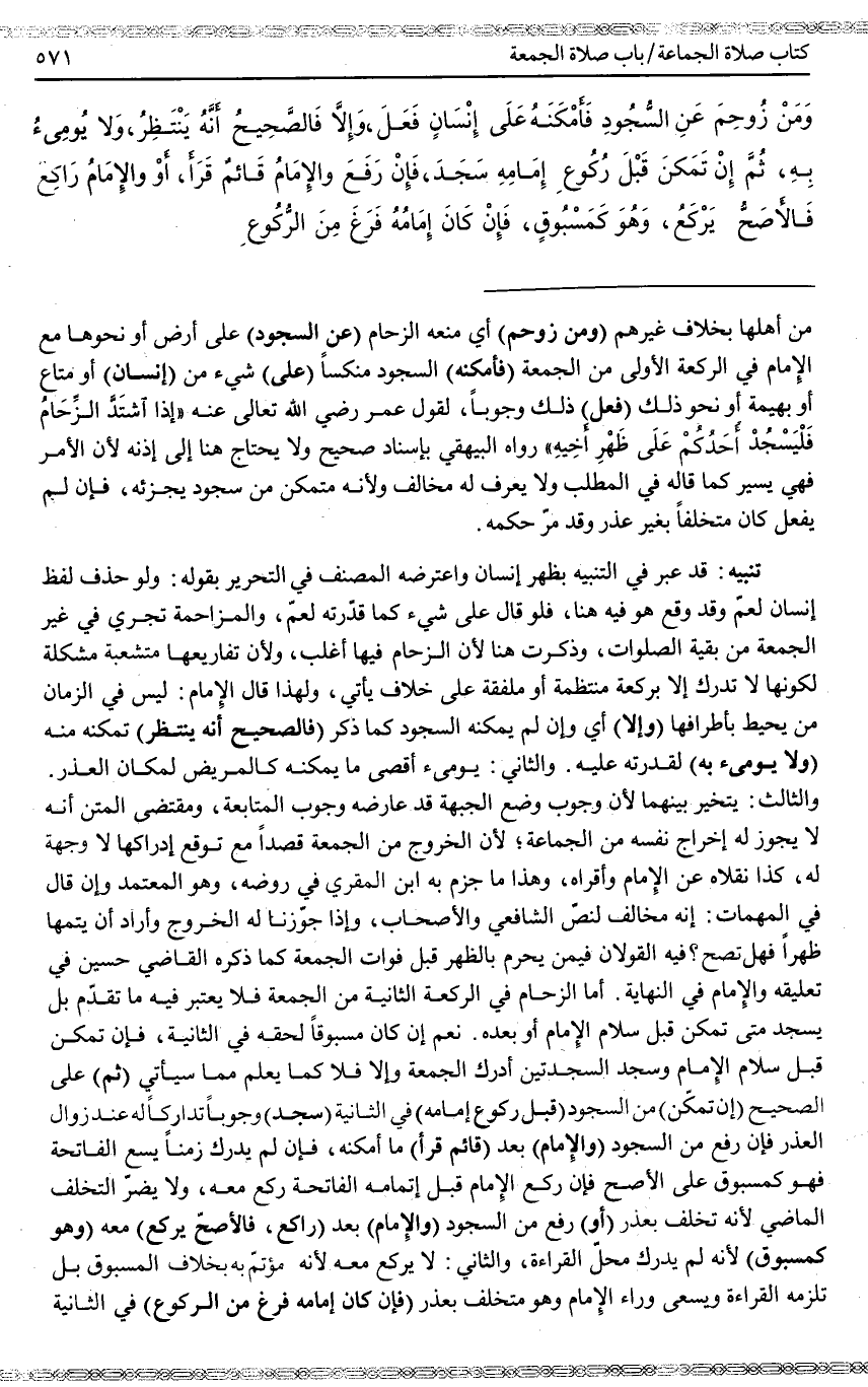 (وَمَنْ زُوحِمَ) أَيْ مَنَعَهُ الزِّحَامُ (عَنْ السُّجُودِ) عَلَى أَرْضٍ أَوْ نَحْوِهَا مَعَ الْإِمَامِ فِي الرَّكْعَةِ الْأُولَى مِنْ الْجُمُعَةِ (فَأَمْكَنَهُ) السُّجُودُ مُنَكَّسًا (عَلَى) شَيْءٍ مِنْ (إنْسَانٍ) أَوْ مَتَاعٍ أَوْ بَهِيمَةٍ أَوْ نَحْوِ ذَلِكَ (فَعَلَ) ذَلِكَ وُجُوبًا، لِقَوْلِ عُمَرَ - رَضِيَ اللَّهُ تَعَالَى عَنْهُ - " إذَا اشْتَدَّ الزِّحَامُ فَلْيَسْجُدْ أَحَدُكُمْ عَلَى ظَهْرِ أَخِيهِ " رَوَاهُ الْبَيْهَقِيُّ بِإِسْنَادٍ صَحِيحٍ وَلَا يَحْتَاجُ هُنَا إلَى إذْنِهِ لِأَنَّ الْأَمْرَ فِيهَا يَسِيرٌ كَمَا قَالَهُ فِي الْمَطْلَبِ وَلَا يُعْرَفُ لَهُ مُخَالِفٌ وَلِأَنَّهُ مُتَمَكِّنٌ مِنْ سُجُودٍ يُجْزِئُهُ، فَإِنْ لَمْ يَفْعَلْ كَانَ مُتَخَلِّفًا بِغَيْرِ عُذْرٍ وَقَدْ مَرَّ حُكْمُهُ. تَنْبِيهٌ قَدْ عَبَّرَ فِي التَّنْبِيهِ بِظَهْرِ إنْسَانٍ وَاعْتَرَضَهُ الْمُصَنِّفُ فِي التَّحْرِيرِ بِقَوْلِهِ: وَلَوْ حَذَفَ لَفْظَ إنْسَانٍ لَعَمَّ وَقَدْ وَقَعَ هُوَ فِيهِ هُنَا، فَلَوْ قَالَ عَلَى شَيْءٍ كَمَا قَدَّرْته لَعَمَّ، وَالْمُزَاحَمَةُ تَجْرِي فِي غَيْرِ الْجُمُعَةِ مِنْ بَقِيَّةِ الصَّلَوَاتِ، وَذُكِرَتْ هُنَا؛ لِأَنَّ الزِّحَامَ فِيهَا أَغْلَبُ، وَلِأَنَّ تَفَارِيعَهَا مُتَشَعِّبَةٌ مُشْكِلَةٌ لِكَوْنِهَا لَا تُدْرَكُ إلَّا بِرَكْعَةٍ مُنْتَظِمَةٍ أَوْ مُلَفَّقَةٍ عَلَى خِلَافٍ يَأْتِي، وَلِهَذَا قَالَ الْإِمَامُ: لَيْسَ فِي الزَّمَانِ مَنْ يُحِيطُ بِأَطْرَافِهَا (وَإِلَّا) أَيْ وَإِنْ لَمْ يُمْكِنْهُ السُّجُودُ كَمَا ذُكِرَ (فَالصَّحِيحُ أَنَّهُ يُنْتَظَرُ) تَمَكُّنَهُ مِنْهُ (وَلَا يُومِئُ بِهِ) لِقُدْرَتِهِ عَلَيْهِ.