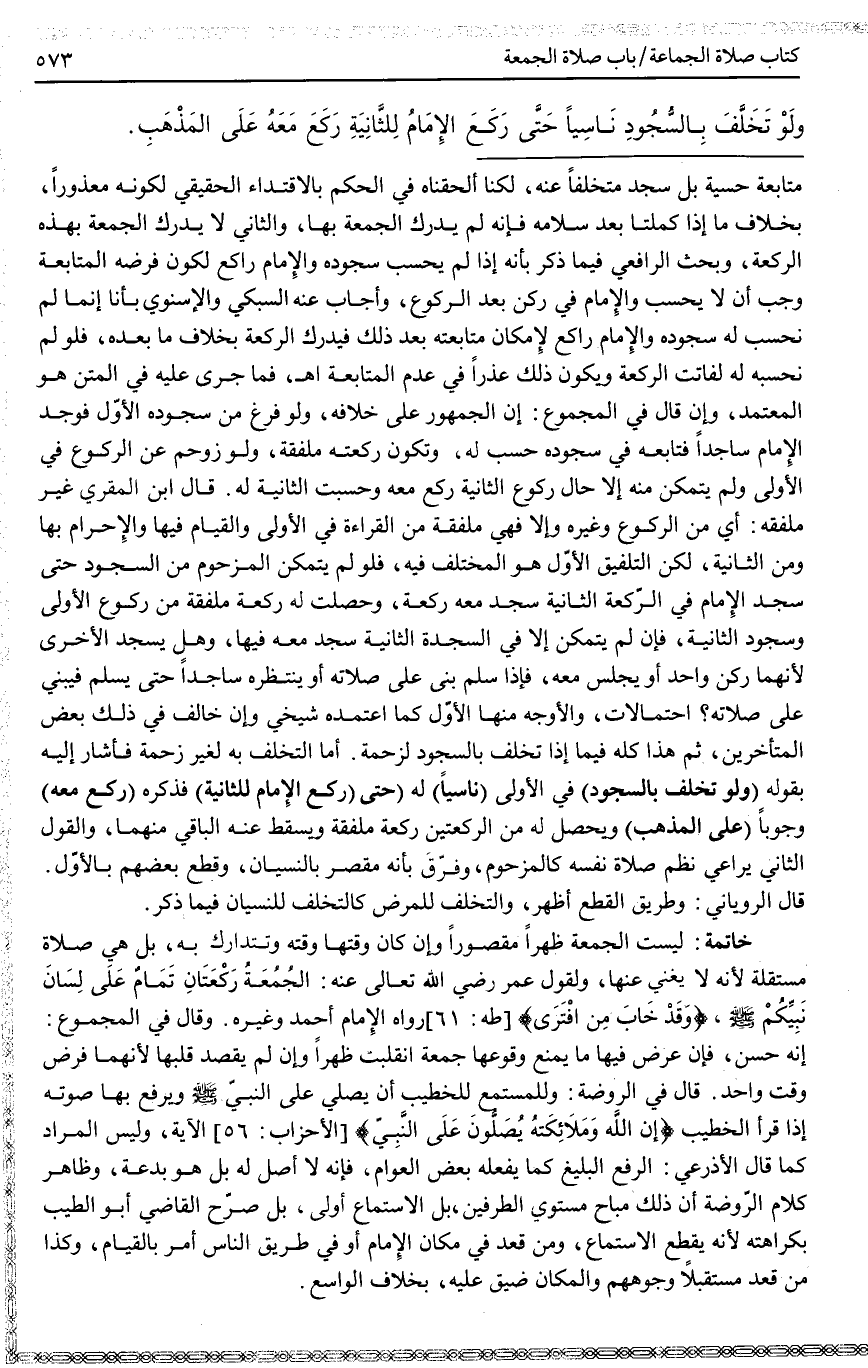 وَالْأَوْجَهُ مِنْهَا الْأَوَّلُ كَمَا اعْتَمَدَهُ شَيْخِي وَإِنْ خَالَفَ فِي ذَلِكَ بَعْضُ الْمُتَأَخِّرِينَ، ثُمَّ هَذَا كُلُّهُ فِيمَا إذَا تَخَلَّفَ بِالسُّجُودِ لِزَحْمَةٍ. أَمَّا التَّخَلُّفُ بِهِ لِغَيْرِ زَحْمَةٍ فَأَشَارَ إلَيْهِ بِقَوْلِهِ (وَلَوْ تَخَلَّفَ بِالسُّجُودِ) فِي الْأُولَى (نَاسِيًا) لَهُ (حَتَّى رَكَعَ الْإِمَامُ لِلثَّانِيَةِ) فَذَكَرَهُ (رَكَعَ مَعَهُ) وُجُوبًا (عَلَى الْمَذْهَب) وَيَحْصُلُ لَهُ مِنْ الرَّكْعَتَيْنِ رَكْعَةٌ مُلَفَّقَةٌ وَيَسْقُطُ عَنْهُ الْبَاقِي مِنْهُمَا، وَالْقَوْلُ الثَّانِي يُرَاعِي نَظْمَ صَلَاةِ نَفْسِهِ كَالْمَزْحُومِ، وَفُرِّقَ بِأَنَّهُ مُقَصِّرٌ بِالنِّسْيَانِ، وَقَطَعَ بَعْضُهُمْ بِالْأَوَّلِ. قَالَ الرُّويَانِيُّ: وَطَرِيقُ الْقَطْعِ أَظْهَرُ، وَالتَّخَلُّفُ لِلْمَرَضِ كَالتَّخَلُّفِ لِلنِّسْيَانِ فِيمَا ذُكِرَ. خَاتِمَةٌ: لَيْسَتْ الْجُمُعَةُ ظُهْرًا مَقْصُورًا وَإِنْ كَانَ وَقْتُهَا وَقْتَهُ وَتُتَدَارَكُ بِهِ، بَلْ هِيَ صَلَاةٌ مُسْتَقِلَّةٌ لِأَنَّهُ لَا يُغْنِي عَنْهَا، وَلِقَوْلِ عُمَرَ - رَضِيَ اللَّهُ تَعَالَى عَنْهُ -: الْجُمُعَةُ رَكْعَتَانِ تَمَامٌ عَلَى لِسَانِ نَبِيِّكُمْ - صَلَّى اللَّهُ عَلَيْهِ وَسَلَّمَ - {وَقَدْ خَابَ مَنِ افْتَرَى} [طه: 61] طَه رَوَاهُ الْإِمَامُ أَحْمَدُ وَغَيْرُهُ.