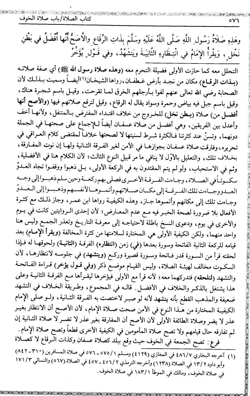 ـــــــــــــــــــــــــــــQالتَّحَلُّلِ مَعَهُ كَمَا حَازَتْ الْأُولَى فَضِيلَةَ التَّحَرُّمِ مَعَهُ (وَهَذِهِ صَلَاةُ رَسُولِ اللَّهِ - صَلَّى اللَّهُ عَلَيْهِ وَسَلَّمَ -) أَيْ صِفَةُ صَلَاتِهِ (بِذَاتِ الرِّقَاعِ) مَكَانٌ مِنْ نَجْدٍ بِأَرْضِ غَطَفَانَ، رَوَاهَا الشَّيْخَانِ (1) أَيْضًا وَسُمِّيَتْ بِذَلِكَ لِأَنَّ الصَّحَابَةَ - رَضِيَ اللَّهُ تَعَالَى عَنْهُمْ - لَفُّوا بِأَرْجُلِهِمْ الْخِرَقَ لَمَّا تَقَرَّحَتْ.
