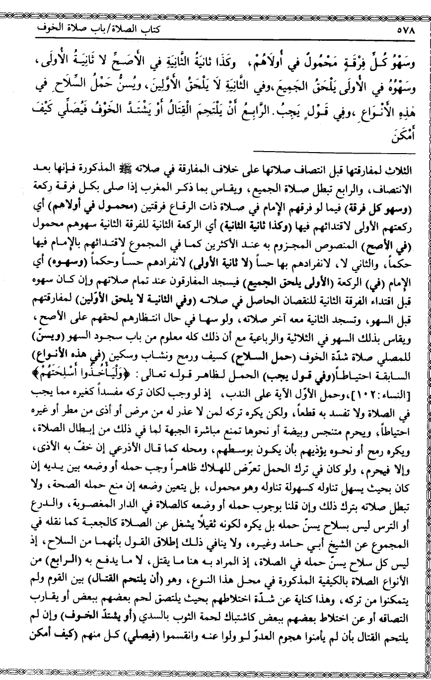 وَسَهْوُ كُلِّ فِرْقَةٍ مَحْمُولٌ فِي أُولَاهُمْ، وَكَذَا ثَانِيَةُ الثَّانِيَةِ فِي الْأَصَحِّ لَا ثَانِيَةُ الْأُولَى، وَسَهْوُهُ فِي الْأُولَى يَلْحَقُ الْجَمِيعَ، وَفِي الثَّانِيَةِ لَا يَلْحَقُ الْأَوَّلِينَ، وَيُسَنُّ حَمْلُ السِّلَاحِ فِي هَذِهِ الْأَنْوَاعِ، وَفِي قَوْلٍ يَجِبُ.