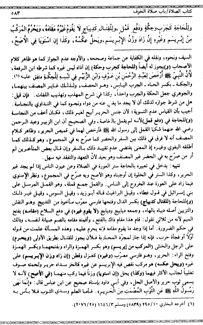 تَنْبِيهٌ: يَدْخُلُ فِي تَعْبِيرِهِ بِالْحَاجَةِ سَتْرُ الْعَوْرَةِ فِي الصَّلَاةِ وَعَنْ عُيُونِ النَّاسِ إذَا لَمْ يَجِدْ غَيْرَ الْحَرِيرِ، وَكَذَا السَّتْرُ فِي الْخَلْوَةِ إنْ أَوْجَبْنَاهُ وَهُوَ الْأَصَحُّ وَبِهِ صَرَّحَ فِي الْمَجْمُوعِ، وَنَظَرَ الْإِسْنَوِيُّ فِيمَا زَادَ عَلَى الْعَوْرَةِ عِنْدَ الْخُرُوجِ إلَى النَّاسِ. وَالْقَمْلُ جَمْعُ قَمْلَةٍ، وَهُوَ الْقَمْلُ الْمُرْسَلُ عَلَى بَنِي إسْرَائِيلَ فِي قَوْلِ عَطَاءٍ، وَقِيلَ الْبَرَاغِيثُ قَالَهُ أَبُو زَيْدٍ، وَقِيلَ السُّوسُ، وَقِيلَ غَيْرُ ذَلِكَ (وَ) لِلْحَاجَةِ (لِلْقِتَالِ كَدِيبَاجٍ) بِكَسْرِ الدَّالِ وَفَتْحِهَا فَارِسِيٌّ مُعَرَّبٌ مَأْخُوذٌ مِنْ التَّدْبِيجِ وَهُوَ النَّقْشُ وَالتَّزْيِينُ أَصْلُهُ دِيبَاهٌ بِالْهَاءِ وَجَمْعُهُ دَيَابِيجُ وَدَيَابِجُ (لَا يَقُومُ غَيْرُهُ) فِي دَفْعِ السِّلَاحِ (مَقَامَهُ) بِفَتْحِ الْمِيمِ لِأَنَّهُ مِنْ ثُلَاثِيٍّ تَقُولُ: قَامَ هَذَا مَقَامَ ذَاكَ بِالْفَتْحِ، وَأَقَمْته مُقَامَهُ بِالضَّمِّ صِيَانَةً لِنَفْسِهِ، وَذَلِكَ فِي حُكْمِ الضَّرُورَةِ. أَمَّا إذَا وُجِدَ مَا يَقُومُ مَقَامَهُ فَإِنَّهُ يَحْرُمُ عَلَيْهِ، وَهَذِهِ الْمَسْأَلَةُ عُلِمَتْ مِنْ قَوْلِهِ أَوَّلًا " أَوْ فَجْأَةِ حَرْبٍ " فَإِنَّهُ إذَا جَازَ لِمُجَرَّدِ الْمُحَارَبَةِ فَلَأَنْ يَجُوزَ لِلْقِتَالِ بِطَرِيقِ الْأَوْلَى (وَيَحْرُمُ) عَلَى الرَّجُلِ وَالْخُنْثَى (الْمُرَكَّبُ مِنْ إبْرَيْسَمَ) وَهُوَ بِكَسْرِ الْهَمْزَةِ وَالرَّاءِ وَبِفَتْحِهِمَا وَبِكَسْرِ الْهَمْزَةِ وَفَتْحِ الرَّاءِ: الْحَرِيرُ، وَهُوَ فَارِسِيٌّ مُعَرَّبٌ (وَغَيْرِهِ) كَغَزْلٍ وَقُطْنٍ (إنْ زَادَ وَزْنُ الْإِبْرَيْسَمِ) عَلَى غَيْرِهِ (وَيَحِلُّ عَكْسُهُ) هُوَ مُرَكَّبٌ نَقَصَ فِيهِ الْإِبْرَيْسَمُ عَنْ غَيْرِهِ كَالْخَزِّ سَدَاهُ حَرِيرٌ وَلُحْمَتُهُ صُوفٌ تَغْلِيبًا لِجَانِبِ الْأَكْثَرِ فِيهِمَا (وَكَذَا) يَحِلُّ (إنْ اسْتَوَيَا) وَزْنًا فِيمَا رُكِّبَ مِنْهُمَا (فِي الْأَصَحِّ) لِأَنَّهُ لَا يُسَمَّى ثَوْبَ حَرِيرٍ وَالْأَصْلُ الْحِلُّ، وَفِي أَبِي دَاوُد بِإِسْنَادٍ صَحِيحٍ عَنْ ابْنِ عَبَّاسٍ قَالَ: «إنَّمَا نَهَى رَسُولُ اللَّهِ - صَلَّى اللَّهُ عَلَيْهِ وَسَلَّمَ - عَنْ الثَّوْبِ الْمُصْمَتِ مِنْ الْحَرِيرِ» . فَأَمَّا الْعَلَمُ وَسَدَى الثَّوْبِ فَلَا بَأْسَ بِهِ