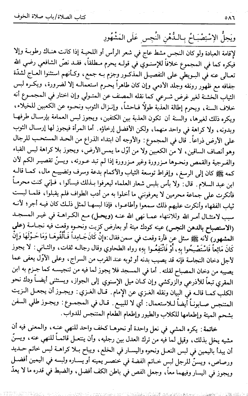 (وَيَحِلُّ) مَعَ الْكَرَاهَةِ فِي غَيْرِ الْمَسْجِدِ (الِاسْتِصْبَاحُ بِالدُّهْنِ النَّجِسِ) عَيْنُهُ كَوَدَكِ مَيْتَةٍ أَوْ بِعَارِضٍ كَزَيْتٍ وَنَحْوِهِ وَقَعَتْ فِيهِ نَجَاسَةٌ (عَلَى الْمَشْهُورِ) لِأَنَّهُ - صَلَّى اللَّهُ عَلَيْهِ وَسَلَّمَ - سُئِلَ عَنْ فَأْرَةٍ وَقَعَتْ فِي سَمْنٍ فَقَالَ: «إنْ كَانَ جَامِدًا فَأَلْقُوهَا وَمَا حَوْلَهَا وَإِنْ كَانَ مَائِعًا فَاسْتَصْبِحُوا بِهِ، أَوْ فَانْتَفِعُوا بِهِ» رَوَاهُ الطَّحَاوِيُّ وَقَالَ رِجَالُهُ ثِقَاتٌ؛ وَالثَّانِي: لَا يَجُوزُ لِأَجْلِ دُخَانِ النَّجَاسَةِ فَإِنَّهُ قَدْ يُصِيبُ بَدَنَهُ أَوْ ثَوْبَهُ عِنْدَ الْقُرْبِ مِنْ السِّرَاجِ، وَعَلَى الْأَوَّلِ يُعْفَى عَمَّا يُصِيبُهُ مِنْ دُخَانِ الْمِصْبَاحِ لِقِلَّتِهِ. أَمَّا فِي الْمَسْجِدِ فَلَا يَجُوزُ لِمَا فِيهِ مِنْ تَنْجِيسِهِ كَمَا جَزَمَ بِهِ ابْنُ الْمُقْرِي تَبَعًا لِلْأَذْرَعِيِّ وَالزَّرْكَشِيِّ وَإِنْ كَانَ مَيْلُ الْإِسْنَوِيِّ إلَى الْجَوَازِ، وَيُسْتَثْنَى أَيْضًا وَدَكُ نَحْوِ الْكَلْبِ كَمَا قَالَهُ فِي الْبَيَانِ وَنَقَلَهُ الْغَزِّيُّ عَنْ الْإِمَامِ. قَالَ الْغَزِّيُّ: وَيَجُوزُ أَنْ يَجْعَلَ الزَّيْتَ الْمُتَنَجِّسَ صَابُونًا أَيْضًا لِلِاسْتِعْمَالِ: أَيْ لَا لِلْبَيْعِ. قَالَ فِي الْمَجْمُوعِ: وَيَجُوزُ طَلْيُ السُّفُنِ بِشَحْمِ الْمَيْتَةِ، وَإِطْعَامُهَا لِلْكِلَابِ وَالطُّيُورِ، وَإِطْعَامُ الطَّعَامِ الْمُتَنَجِّسِ لِلدَّوَابِّ.