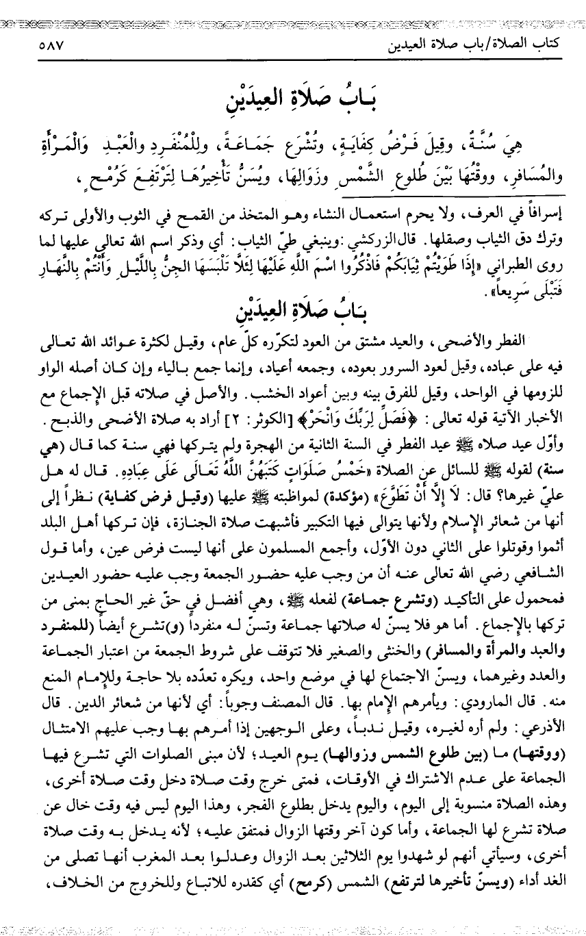 بَابُ صَلَاةِ الْعِيدَيْنِ هِيَ سُنَّةٌ، وَقِيلَ فَرْضُ كِفَايَةٍ، وَتُشْرَعُ جَمَاعَةً، وَلِلْمُنْفَرِدِ وَالْعَبْدِ وَالْمَرْأَةِ وَالْمُسَافِرِ، وَوَقْتُهَا بَيْنَ طُلُوعِ الشَّمْسِ وَزَوَالِهَا، وَيُسَنُّ تَأْخِيرُهَا لِتَرْتَفِعَ كَرُمْحٍ،