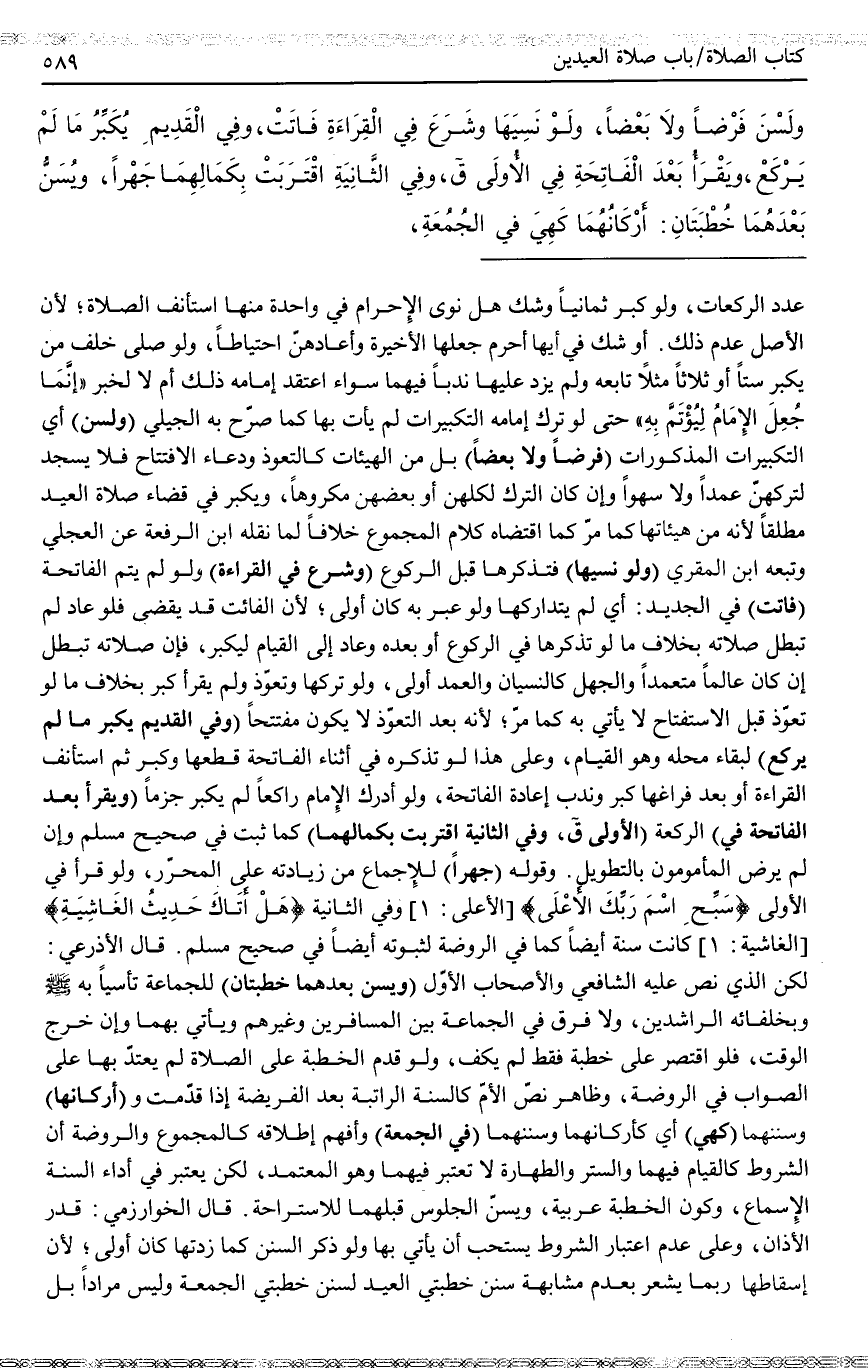 وَلَسْنَ فَرْضًا وَلَا بَعْضًا، وَلَوْ نَسِيَهَا وَشَرَعَ فِي الْقِرَاءَةِ فَاتَتْ، وَفِي الْقَدِيمِ يُكَبِّرُ مَا لَمْ يَرْكَعْ، وَيَقْرَأُ بَعْدَ الْفَاتِحَةِ فِي الْأُولَى " ق "، وَفِي الثَّانِيَةِ اقْتَرَبَتْ بِكَمَالِهِمَا جَهْرًا، وَيُسَنُّ بَعْدَهُمَا خُطْبَتَانِ: أَرْكَانُهُمَا كَهِيَ فِي الْجُمُعَةِ،