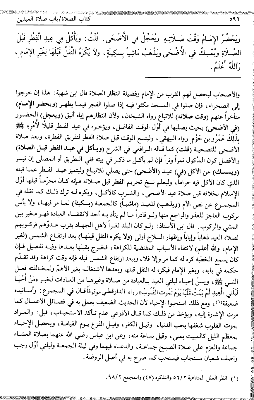 ـــــــــــــــــــــــــــــQوَالْأَصْحَابُ لِيَحْصُلَ لَهُمْ الْقُرْبُ مِنْ الْإِمَامِ وَفَضِيلَةُ انْتِظَارِ الصَّلَاةِ قَالَ ابْنُ شُهْبَةَ: هَذَا إنْ خَرَجُوا إلَى الصَّحْرَاءِ، فَإِنْ صَلَّوْا فِي الْمَسْجِدِ مَكَثُوا فِيهِ إذَا صَلَّوْا الْفَجْرَ فِيمَا يَظْهَرُ (وَيَحْضُرُ الْإِمَامُ) مُتَأَخِّرًا عَنْهُمْ (وَقْتَ صَلَاتِهِ) لِلِاتِّبَاعِ رَوَاهُ الشَّيْخَانِ، وَلِأَنَّ انْتِظَارَهُمْ إيَّاهُ أَلْيَقُ (وَيُعَجِّلُ) الْحُضُورَ (فِي الْأَضْحَى) بِحَيْثُ يُصَلِّيهَا فِي أَوَّلِ الْوَقْتِ الْفَاضِلِ، وَيُؤَخِّرُهُ فِي عِيدِ الْفِطْرِ قَلِيلًا لِأَمْرِهِ - صَلَّى اللَّهُ عَلَيْهِ وَسَلَّمَ - بِذَلِكَ عَمْرَو بْنَ حَزْمٍ رَوَاهُ الْبَيْهَقِيُّ، وَلِيَتَّسِعَ الْوَقْتُ قَبْلَ صَلَاةِ الْفِطْرِ لِتَفْرِيقِ الْفِطْرَةِ، وَبَعْدَ صَلَاةِ الْأَضْحَى لِلتَّضْحِيَةِ (قُلْت) كَمَا قَالَهُ الرَّافِعِيُّ فِي الشَّرْحِ.