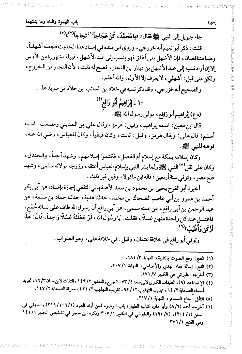 (٨) أخبرنا أَبُو الْفَرَجِ يَحْيَى بْنُ مَحْمُودِ بْنِ سَعْدٍ الأَصْفَهَانِيُّ الثَّقَفِيُّ، إِجَازَةً بِإِسْنَادِهِ، عن أَبِي بَكْرٍ أَحْمَدَ بْنِ عَمْرِو بْنِ أَبِي عَاصِمٍ الضَّحَّاكِ بْنِ مَخْلَدٍ، حدثنا هُدْبَةُ، حدثنا حَمَّادُ بْنُ سَلَمَةَ، عن عَبْدِ الرَّحْمَنِ بْنِ أَبِي رَافِعٍ، عن عَمَّتِهِ سَلْمَى، عن أَبِي رَافِعٍ، أَنَّ رَسُولَ اللَّهِ طَافَ عَلَى نِسَائِه جَمْعٌ، فَاغْتَسَلَ عِنْدَ كُلِّ وَاحِدَةِ مِنْهُنَّ غُسْلا، فَقُلْتُ: يَا رَسُولَ اللَّهِ، لَوْ جَعَلْتَهُ غُسْلا وَاحِدًا، قَالَ: هَذَا أَزْكَى وَأَطْيَبُ وتوفي أَبُو رافع في خلافه عثمان، وقيل: في خلافة علي، وهو الصواب.