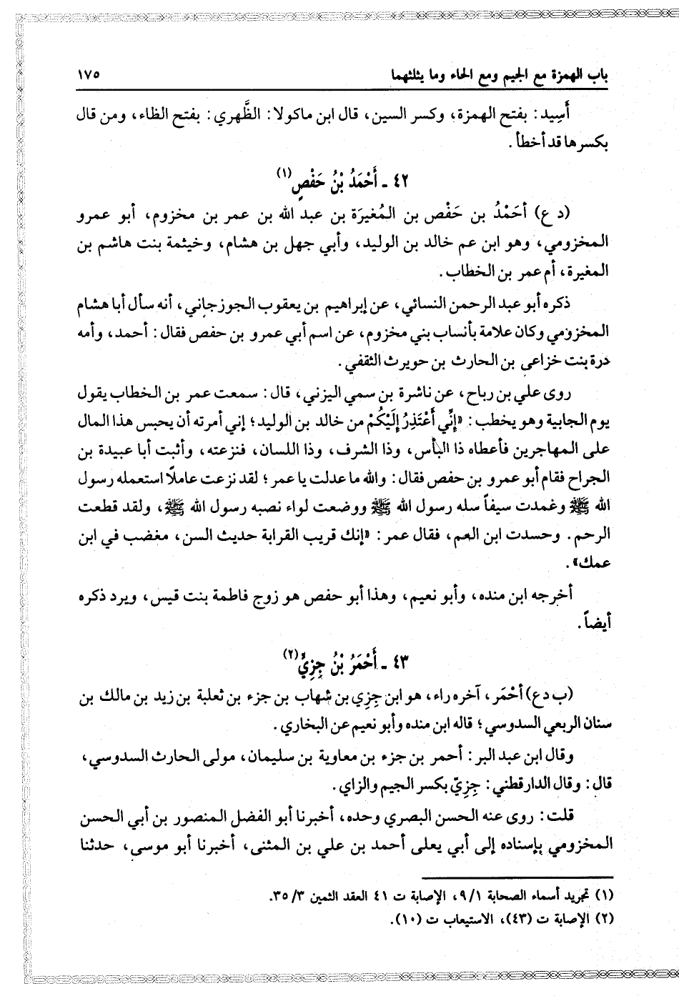 د ع: أحمد بْن حفص بْن المغيرة بْن عَبْد اللَّهِ بْن عمر بْن مخزوم، أَبُو عمرو المخزومي وهو ابن عم خَالِد بْن الْوَلِيد، وأبي جهل بْن هشام، وخيثمة بنت هاشم بْن المغيرة أم عمر بْن الخطاب ذكره أَبُو عبد الرحمن النسائي، عن إِبْرَاهِيم بْن يعقوب الجوزجاني، أَنَّهُ سأل أبا هشام المخزومي، وكان علامة بأنساب بني مخزوم، عن اسم أَبِي عمرو بْن حفص، فقال: أحمد، وأمه درة بنت خزاعي بْن الحارث بْن حويرث الثقفي.