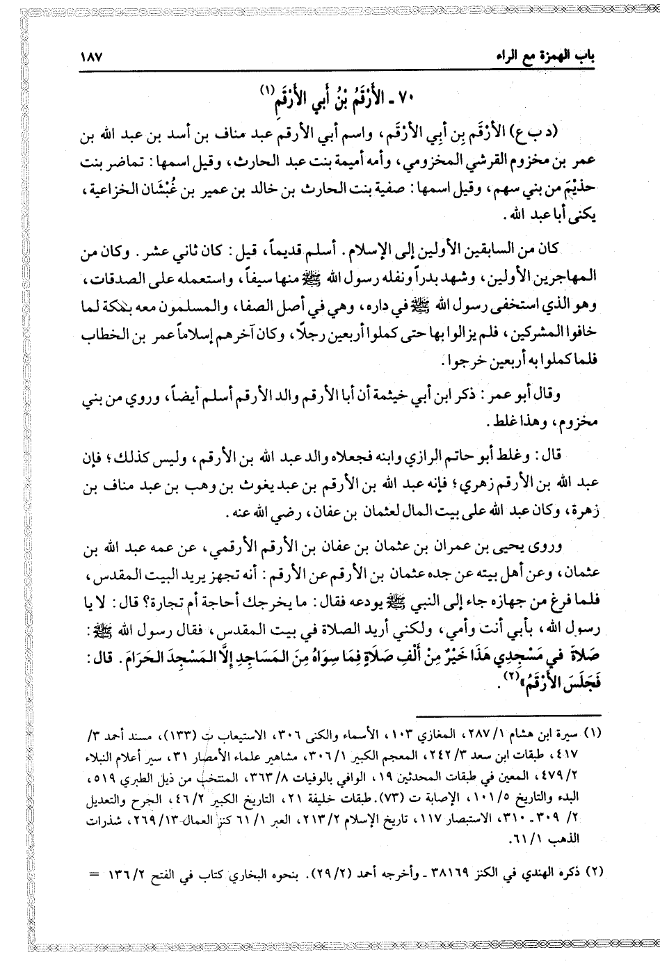 وروى يحيى بْن عمران بْن عثمان بْن عفان بْن الأرقم الأرقمي، عن عمه عَبْد اللَّهِ بْن عثمان، وَعَنْ أهَل بيته، عن جده عثمان بْن الأرقم، عن الأرقم، أَنَّهُ تجهز يريد البيت المقدس، فلما فرغ من جهازه جاء إِلَى النَّبِيّ صَلَّى اللَّهُ عَلَيْهِ وَسَلَّمَ يودعه، فقال: ما يخرجك أحاجة أم تجارة؟، قال: لا يا رَسُول اللَّهِ، بأبي أنت وأمي، ولكني أريد الصلاة في بيت المقدس، فقال رَسُول اللَّهِ صَلَّى اللَّهُ عَلَيْهِ وَسَلَّمَ: صلاة في مسجدي هذا خير من ألف صلاة فيما سواه من المساجد إلا المسجد الحرام، قال: فجلس الأرقم.