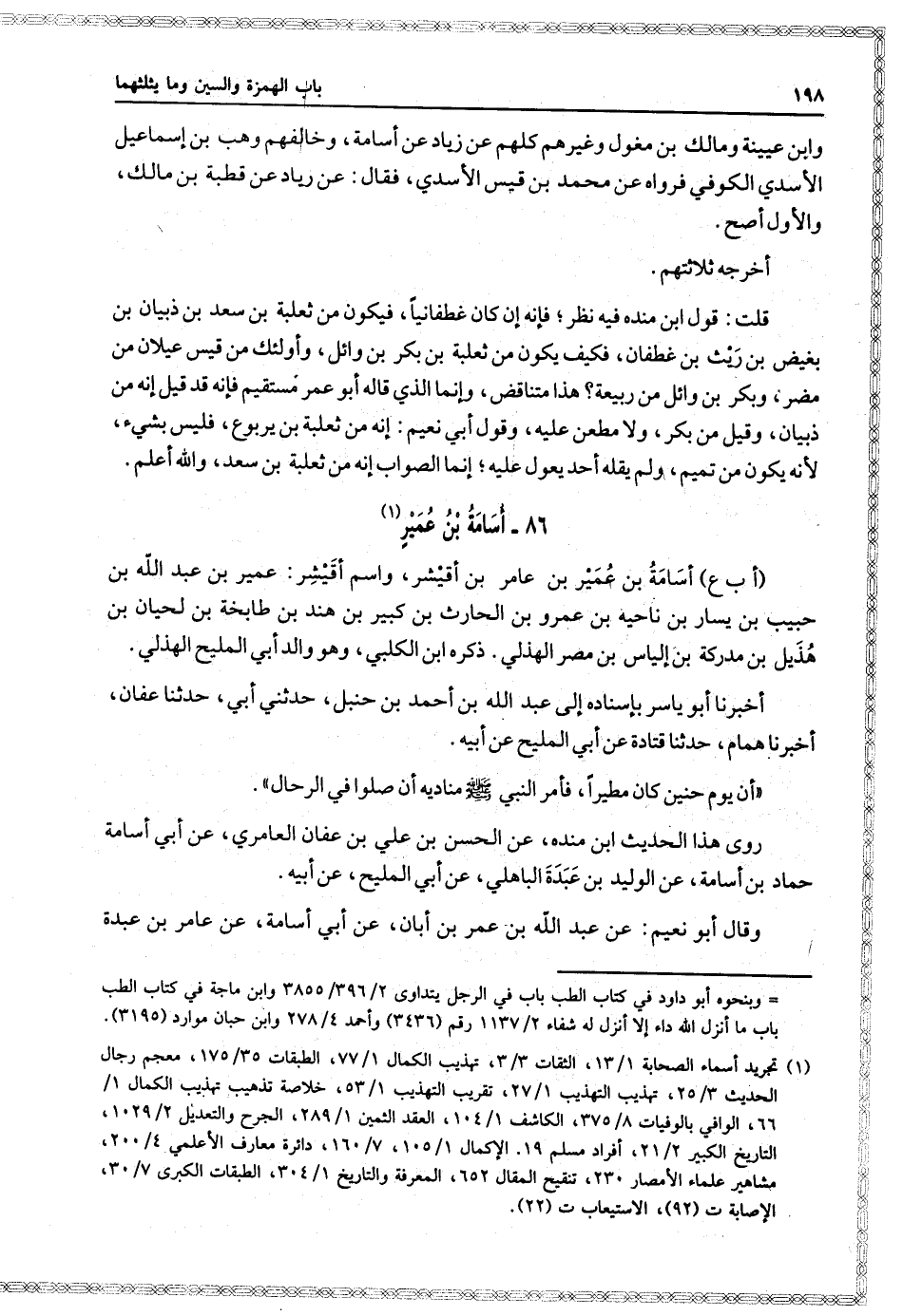 وَقَالَ أَبُو نُعَيْمٍ: عن عَبْدِ اللَّهِ بْنِ عُمَرَ بْنِ أَبَانٍ، عن أَبِي أُسَامَةَ، عن عَامِرِ بْنِ عَبْدَةَ الْبَاهِلِيِّ، عن أَبِي الْمُلَيْحِ، عن أَبِيهِ، قَالَ: وَوَهِمَ فِيهِ بَعْضُ الْوَاهِمِينَ، يَعْنِي: ابْنَ مَنْدَهْ، عن أَبِي أُسَامَةَ، فَقَالَ: عن الْوَلِيدِ بْنِ عَبْدَةَ، وَهُوَ كُوفِيٌّ، وَإِنَّمَا هُوَ عن عَامِرِ بْنِ عَبْدَةَ، وَقِيلَ: عُبَادَةُ