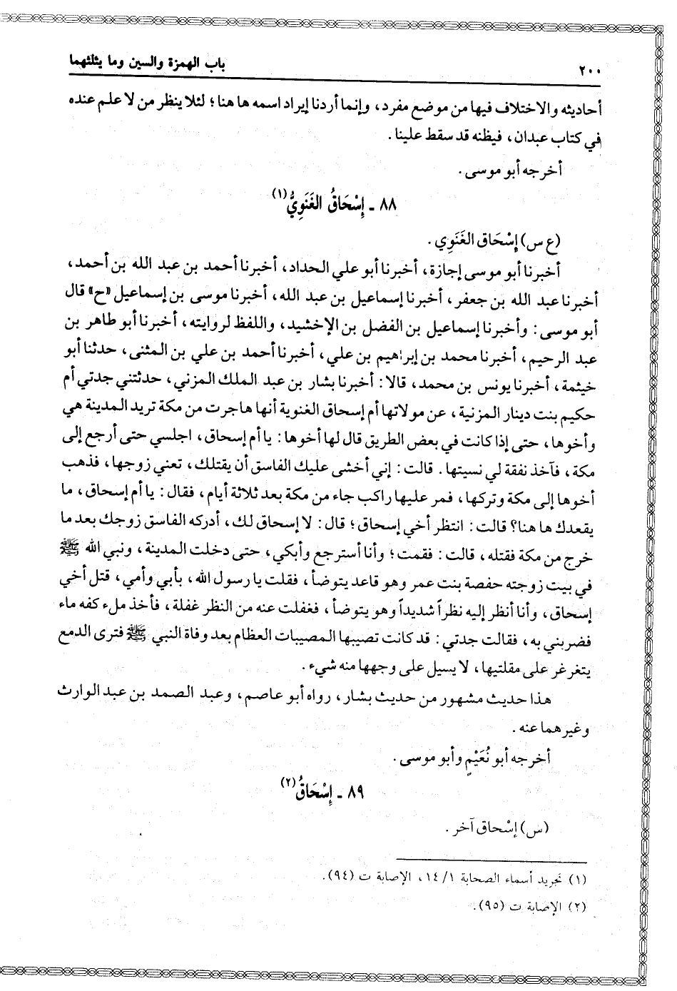 ح قَالَ أَبُو مُوسَى: وَأخبرنا إِسْمَاعِيلُ بْنُ الْفَضْلِ بْنِ الإِخْشِيدِ، وَاللَّفْظُ لِرِوَايَتِهِ، أخبرنا أَبُو طَاهِرِ بْنُ عَبْدِ الرَّحِيمِ، أخبرنا مُحَمَّدُ بْنُ إِبْرَاهِيمَ بْنِ عَلِيٍّ، أخبرنا أَحْمَدُ بْنُ عَلِيِّ بْنِ الْمُثَنَّى، حدثنا أَبُو خَيْثَمَةَ، أخبرنا يُونُسُ بْنُ مُحَمَّدٍ، قَالَا: أخبرنا بِشَّارُ بْنُ عَبْدِ الْمَلِكِ الْمُزَنِيُّ، حَدَّثَتْنِي جَدَّتِي أُمُّ حَكِيمِ بِنْتُ دِينَارٍ الْمُزْنِيَةُ، عن مَوْلاتِهَا أُمِّ إِسْحَاقَ الْغَنَوِيَّةِ: أَنَّهَا هَاجَرَتْ مِنْ مَكَّةَ تُرِيدُ الْمَدِينَةَ هِيَ وَأَخُوهَا، حَتَّى إِذَا كَانَتْ فِي بَعْضِ الطَّرِيقِ قَالَ لَهَا أَخُوهَا: يَا أُمَّ إِسْحَاقَ، اجْلِسِي حَتَّى أَرْجِعَ إِلَى مَكَّةَ، فَآخُذُ نَفَقَةً لِي نَسِيتُهَا، قَالَتْ: إِنِّي أَخْشَى عَلَيْكَ الْفَاسِقَ أَنْ يَقْتُلَكَ، تَعْنِي: زَوْجَهَا، فَذَهَبَ أَخُوهَا إِلَى مَكَّةَ وَتَرَكَهَا، فَمَرَّ عَلَيْهَا رَاكِبٌ جَاءَ مِنْ مَكَّةَ بَعْدَ ثَلاثَةِ أَيَّامٍ، فَقَالَ: يَا أُمَّ إِسْحَاقَ، مَا يُقْعِدُكِ هَاهُنَا؟ قَالَتْ: أَنْتَظِرُ أَخِي إِسْحَاقَ، قَالَ: لا إِسْحَاقَ لَكِ، أَدْرَكَهُ الْفَاسِقُ زَوْجُكِ بَعْدَ مَا خَرَجَ مِنْ مَكَّةَ فَقَتَلَهُ، قَالَتْ: فَقُمْتُ، وَأَنَا أَسْتَرْجِعُ وَأَبْكِي، حَتَّى دَخَلْتُ الْمَدِينَةَ، وَنَبِيُّ اللَّهِ صَلَّى اللَّهُ عَلَيْهِ وَسَلَّمَ فِي بَيْتِ زَوْجَتِهِ حَفْصَةَ بِنْتِ عُمَرَ وَهُوَ قَاعِدٌ يَتَوَضَّأُ، فَقُلْتُ: يَا رَسُولَ اللَّهِ، بِأَبِي وَأُمِيِّ، قُتِلَ أَخِي إِسْحَاقُ، وَأَنَا أَنْظُرُ إِلَيْهِ نَظَرًا شَدِيدًا وَهُوَ يَتَوَضَّأُ، فَغَفَلْتُ عَنْهُ مِنَ النَّظَرِ غَفْلَةً، فَأَخَذَ مِلْءَ كَفِّهِ مَاءٌ، فَضَرَبَنِي بِهِ، فَقَالَتْ جَدَّتِي: قَدْ كَانَتْ تُصِيبُهَا الْمُصِيبَاتُ الْعِظَامُ بَعْدَ وَفَاةِ النَّبِيِّ صَلَّى اللَّهُ عَلَيْهِ وَسَلَّمَ فَتَرَى الدَّمْعَ يَتَغَرْغَرُ عَلَى مُقْلَتَيْهَا، لا يَسِيلُ عَلَى وَجْهِهَا مِنْهُ شَيْءٌ.