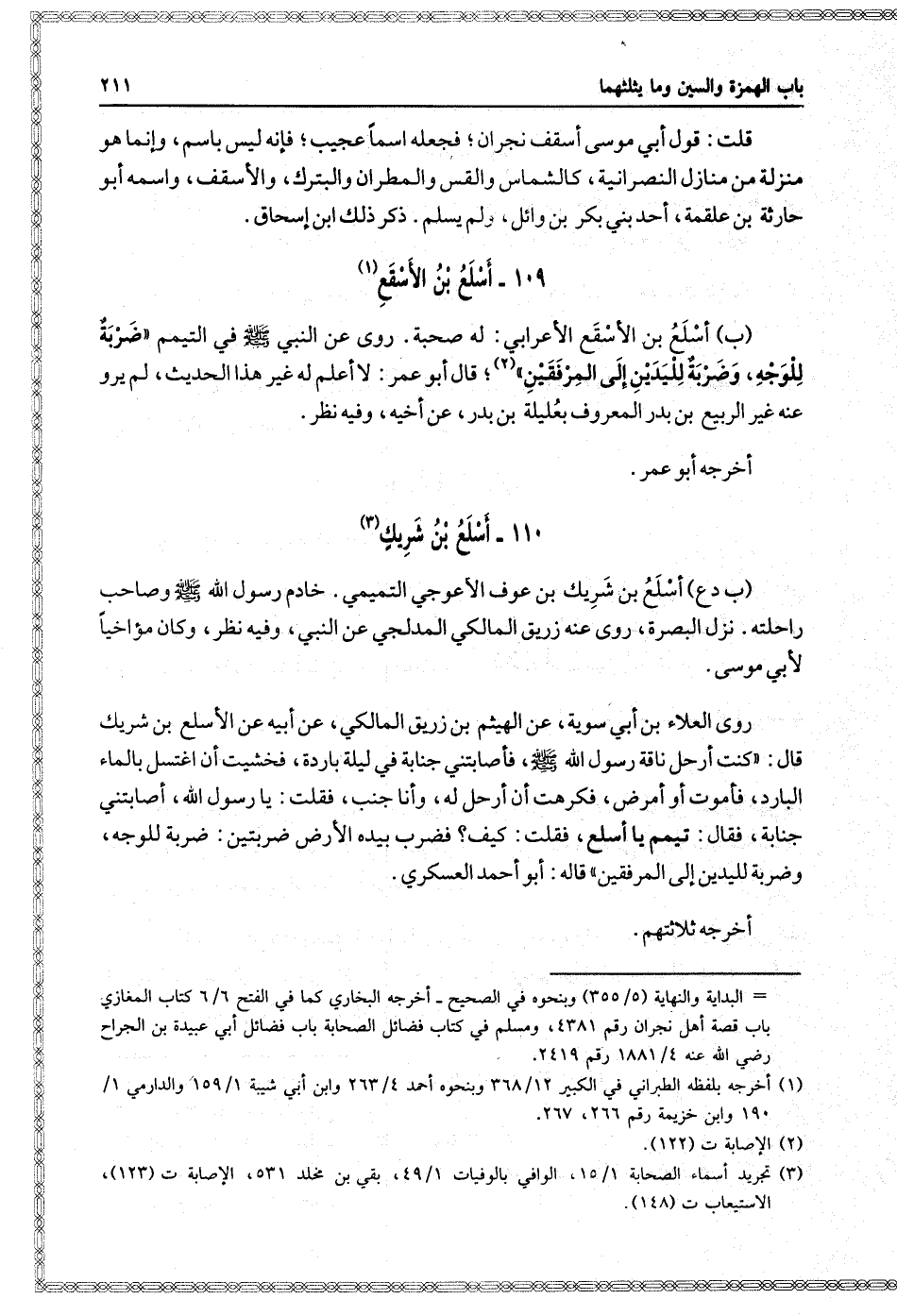 ب: أسلع بْن الأسقع الأعرابي له صحبة، روى عن النَّبِيّ صَلَّى اللَّهُ عَلَيْهِ وَسَلَّمَ في التيمم: ضربة للوجه، وضربة لليدين إِلَى المرفقين.