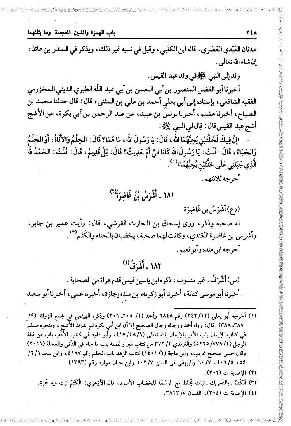 د ع: أشرس بْن غاضرة له صحبة وذكر، روى إِسْحَاق بْن الحارث القرشي، قال: رأيت عمير بْن جابر، وأشرس بْن غاضرة الكندي، وكانت لهما صحبة، يخضبان بالحناء والكتم.