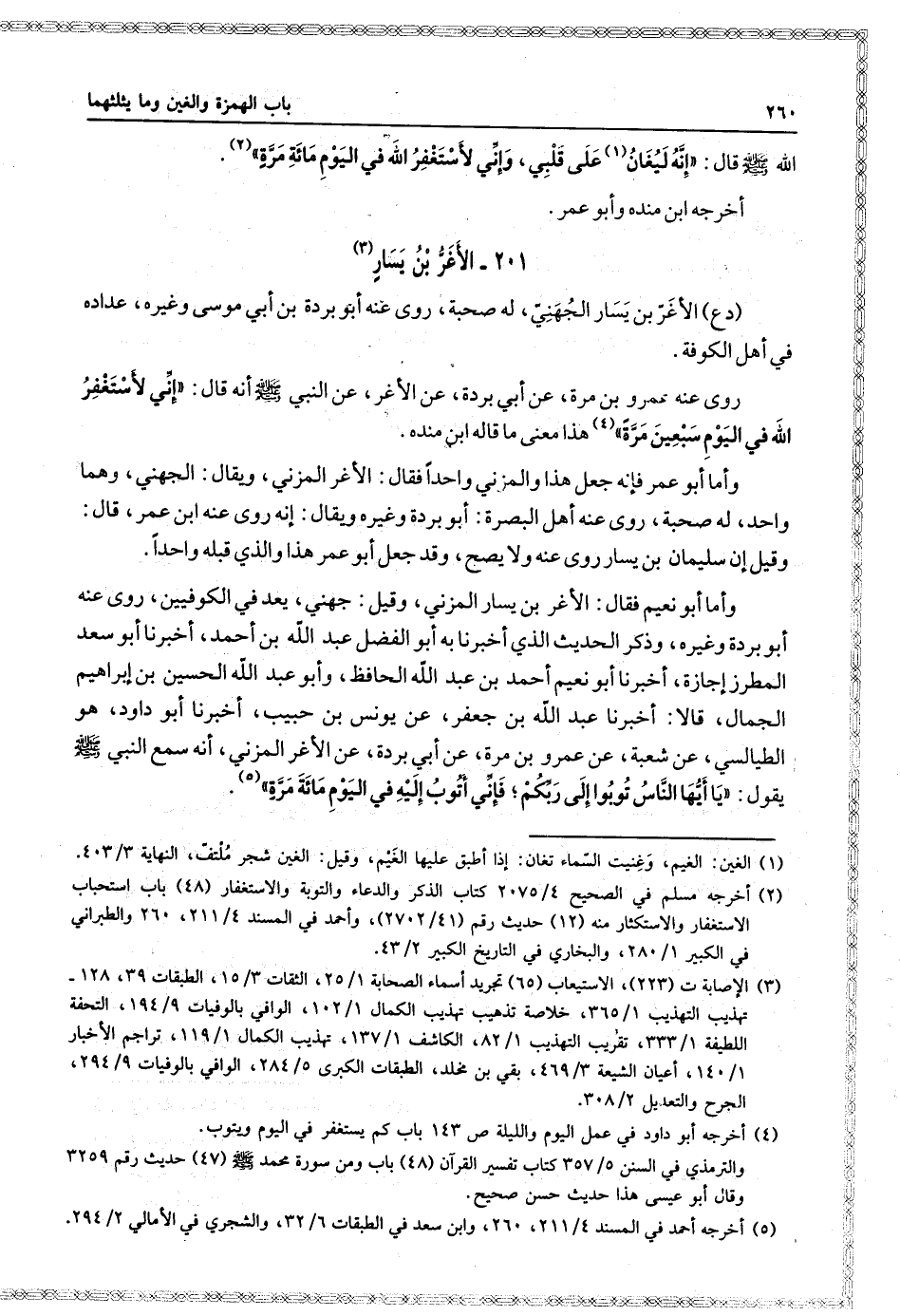 وقد ذكر أَبُو أحمد العسكري ترجمة الأغر المزني، وذكر فيها: إني لأستغفر اللَّه سبعين مرة، وحديث الأوسق من التمر، والله أعلم.