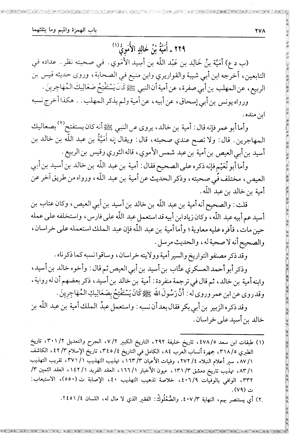 فلعل من جعل أمية المذكور في هذه الترجمة ابن خَالِد بْن عَبْد اللَّهِ، قد أتي من هذا، ويكون قد أسقط خالدًا والد عَبْد اللَّهِ الذي هو ابن أسيد من نسبه، وليس بشيء، فإن أمية بْن عَبْد اللَّهِ بْن خَالِد بْن أسيد المذكور في هذه الترجمة هو الذي وقع الوهم فيه، وقدموا خالدًا عَلَى عَبْد اللَّهِ، والصواب: عَبْد اللَّهِ بْن خَالِد بْن أسيد.