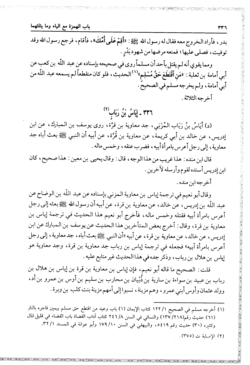 وقال أَبُو نعيم في ترجمة إياس بْن معاوية المزني بِإِسْنَادِهِ عن عَبْد اللَّهِ بْن الوضاح، عن عَبْد اللَّهِ بْن إدريس، عن خَالِد، عن معاوية بْن قرة، عن أبيه، أن رَسُول اللَّهِ صَلَّى اللَّهُ عَلَيْهِ وَسَلَّمَ بعثه إِلَى رجل أعرس بامرأة أبيه، فقتله وخمس ماله، فأخرج أَبُو نعيم هذا الحديث في ترجمة إياس بْن معاوية بْن قرة، وقال: أخرج بعض المتأخرين هذا الحديث، عن يوسف بْن المبارك، عن ابن إدريس، عن خَالِد، عن معاوية بْن قرة، عن أبيه، أن النَّبِيّ صَلَّى اللَّهُ عَلَيْهِ وَسَلَّمَ بعث أباه، جد معاوية، إِلَى رجل أعرس بامرأة أبيه، فجعله في ترجمة إياس بْن رباب جد معاوية بْن قرة، وجد معاوية هو إياس بْن هلال بْن رباب، وذكر جده في هذا الحديث غير متابع عليه.