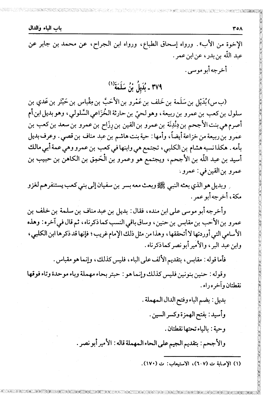 وأخرجه أَبُو موسى عَلَى ابن منده، فقال: بديل بْن عبد مناف بْن سلمة بْن خلف بْن عمرو ابن الأحب بْن مقابس بْن حنين، وساق باقي النسب كما ذكرناه، ثم قال في آخره: وهذه الأسامي التي أوردتها لا أتحققها، وهذا من مثل ذلك الإمام غريب، فإنها قد ذكرها ابن الكلبي، وابن عبد البر، والأمير أَبُو نصر كما ذكرناه.