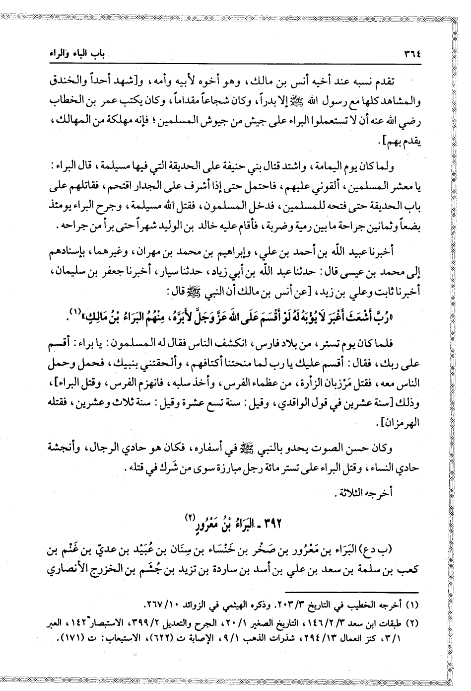 ب د ع: البراء بْن معرور بْن صخر بْن خنساء بْن سنان بْن عبيد بْن عدي بْن غنم بْن كعب بْن سلمة بْن سعد بْن عَلِيِّ بْنِ أسد بْن ساردة بْن تزيد بْن جشم بْن الخزرج الأنصاري الخزرجي السلمي، كنيته: أَبُو بشر، وأمه: الرباب بنت النعمان بْن امرئ القيس بْن زيد بْن عبد الأشهل، عمه سعد بْن معاذ.